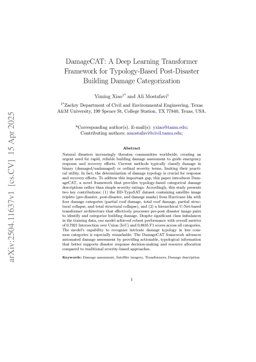 Natural disasters increasingly threaten communities worldwide, creating an urgent need for rapid, reliable building damage assessment to guide emergency response and recovery efforts. Current methods typically classify damage in binary (damaged/undamaged) or ordinal severity terms, limiting their practical utility. In fact, the determination of damage typology is crucial for response and recovery efforts. To address this important gap, this paper introduces DamageCAT, a novel framework that provides typology-based categorical damage descriptions rather than simple severity ratings. Accordingly, this study presents two key contributions: (1) the BD-TypoSAT dataset containing satellite image triplets (pre-disaster, post-disaster, and damage masks) from Hurricane Ida with four damage categories (partial roof damage, total roof damage, partial structural collapse, and total structural collapse), and (2) a hierarchical U-Net-based transformer architecture that effectively processes pre-post disaster image pairs to identify and categorize building damage. Despite significant class imbalances in the training data, our model achieved robust performance with overall metrics of 0.7921 Intersection over Union (IoU) and 0.8835 F1 scores across all categories. The model's capability to recognize intricate damage typology in less common categories is especially remarkable. The DamageCAT framework advances automated damage assessment by providing actionable, typological information that better supports disaster response decision-making and resource allocation compared to traditional severity-based approaches.