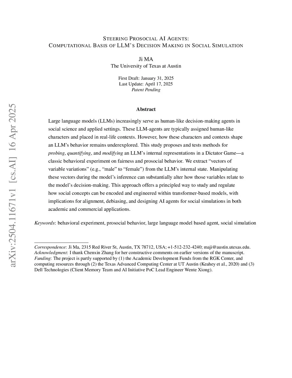 Large language models (LLMs) increasingly serve as human-like decision-making agents in social science and applied settings. These LLM-agents are typically assigned human-like characters and placed in real-life contexts. However, how these characters and contexts shape an LLM's behavior remains underexplored. This study proposes and tests methods for probing, quantifying, and modifying an LLM's internal representations in a Dictator Game, a classic behavioral experiment on fairness and prosocial behavior. We extract ``vectors of variable variations'' (e.g., ``male'' to ``female'') from the LLM's internal state. Manipulating these vectors during the model's inference can substantially alter how those variables relate to the model's decision-making. This approach offers a principled way to study and regulate how social concepts can be encoded and engineered within transformer-based models, with implications for alignment, debiasing, and designing AI agents for social simulations in both academic and commercial applications, strengthening sociological theory and measurement.