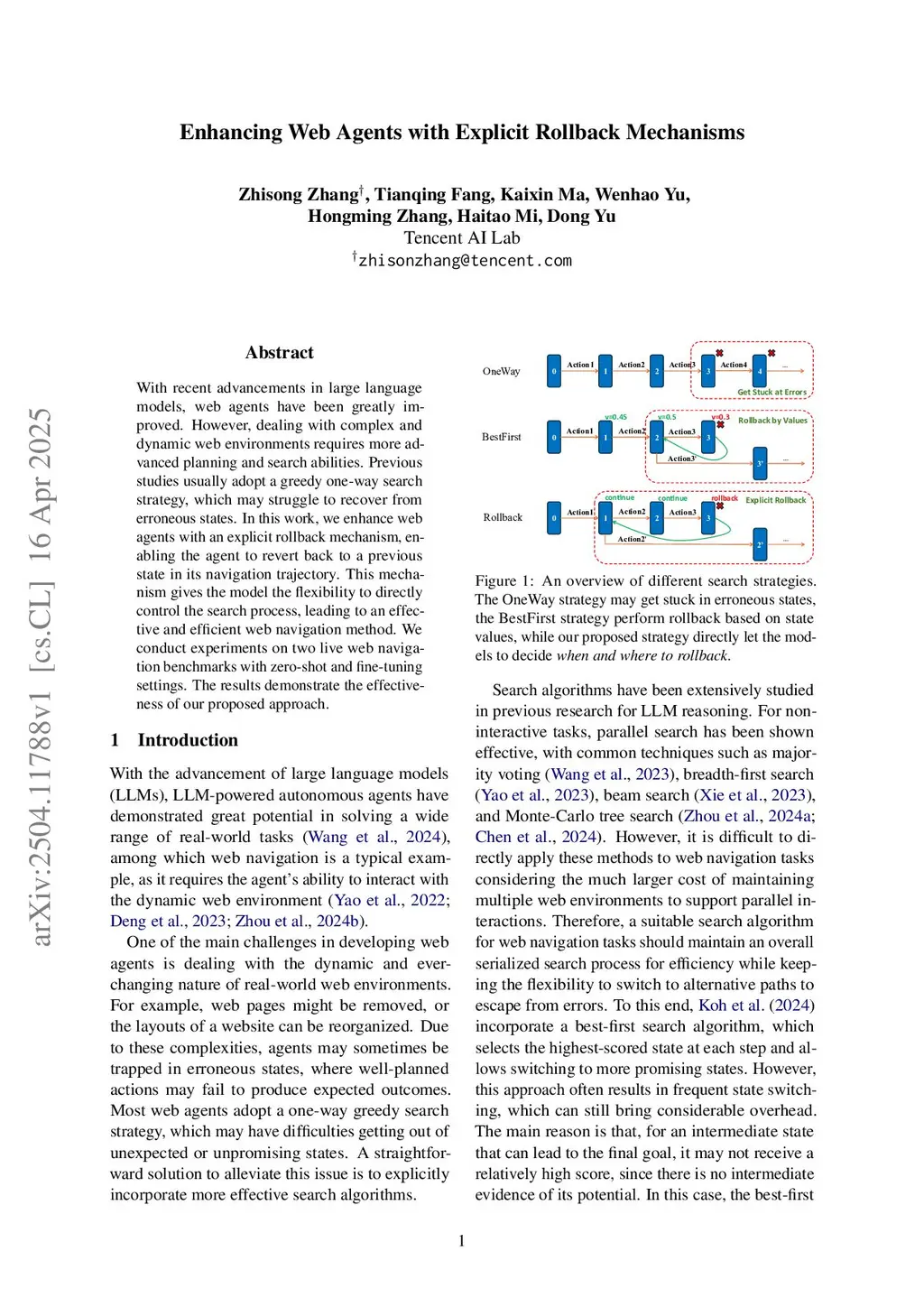 With recent advancements in large language models, web agents have been greatly improved. However, dealing with complex and dynamic web environments requires more advanced planning and search abilities. Previous studies usually adopt a greedy one-way search strategy, which may struggle to recover from erroneous states. In this work, we enhance web agents with an explicit rollback mechanism, enabling the agent to revert back to a previous state in its navigation trajectory. This mechanism gives models the flexibility to directly control the search process, leading to an effective and efficient web navigation method. We conduct experiments on two live web navigation benchmarks with zero-shot and fine-tuning settings. The results demonstrate the effectiveness of our proposed approach.