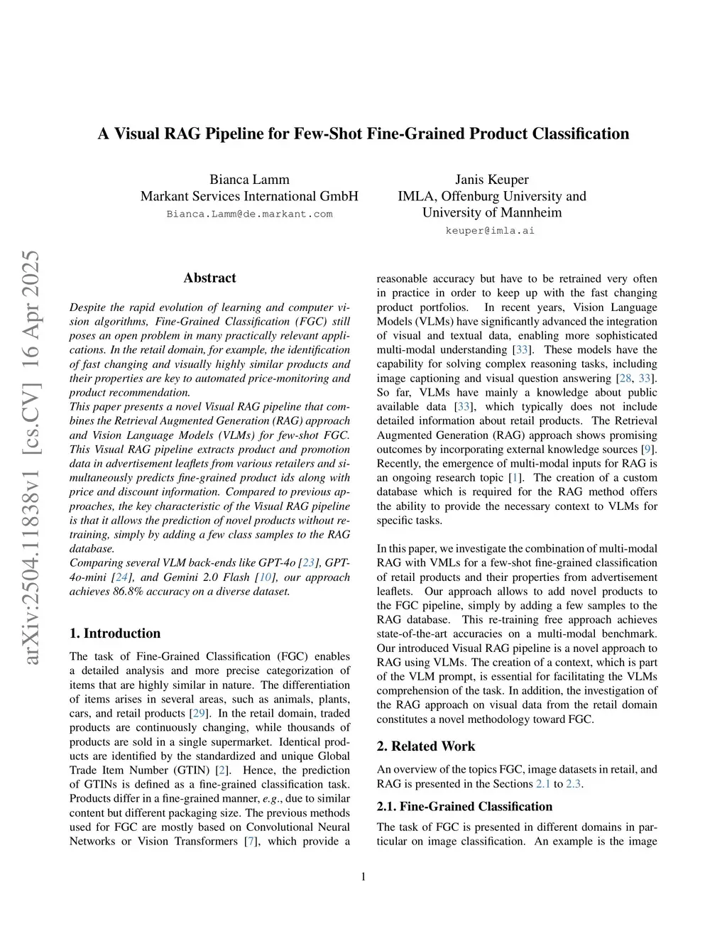 Despite the rapid evolution of learning and computer vision algorithms, Fine-Grained Classification (FGC) still poses an open problem in many practically relevant applications. In the retail domain, for example, the identification of fast changing and visually highly similar products and their properties are key to automated price-monitoring and product recommendation. This paper presents a novel Visual RAG pipeline that combines the Retrieval Augmented Generation (RAG) approach and Vision Language Models (VLMs) for few-shot FGC. This Visual RAG pipeline extracts product and promotion data in advertisement leaflets from various retailers and simultaneously predicts fine-grained product ids along with price and discount information. Compared to previous approaches, the key characteristic of the Visual RAG pipeline is that it allows the prediction of novel products without re-training, simply by adding a few class samples to the RAG database. Comparing several VLM back-ends like GPT-4o [23], GPT-4o-mini [24], and Gemini 2.0 Flash [10], our approach achieves 86.8% accuracy on a diverse dataset.