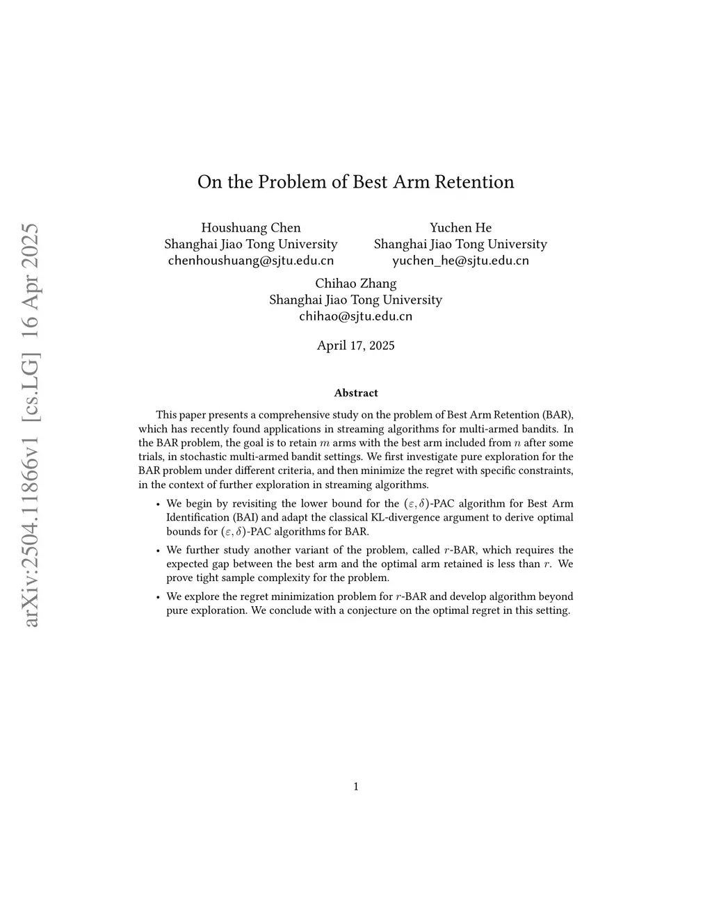 This paper presents a comprehensive study on the problem of Best Arm Retention (BAR), which has recently found applications in streaming algorithms for multi-armed bandits. In the BAR problem, the goal is to retain arms with the best arm included from after some trials, in stochastic multi-armed bandit settings. We first investigate pure exploration for the BAR problem under different criteria, and then minimize the regret with specific constraints, in the context of further exploration in streaming algorithms.- We begin by revisiting the lower bound for the -PAC algorithm for Best Arm Identification (BAI) and adapt the classical KL-divergence argument to derive optimal bounds for -PAC algorithms for BAR.- We further study another variant of the problem, called -BAR, which requires the expected gap between the best arm and the optimal arm retained is less than . We prove tight sample complexity for the problem.- We explore the regret minimization problem for -BAR and develop algorithm beyond pure exploration. We conclude with a conjecture on the optimal regret in this setting.
