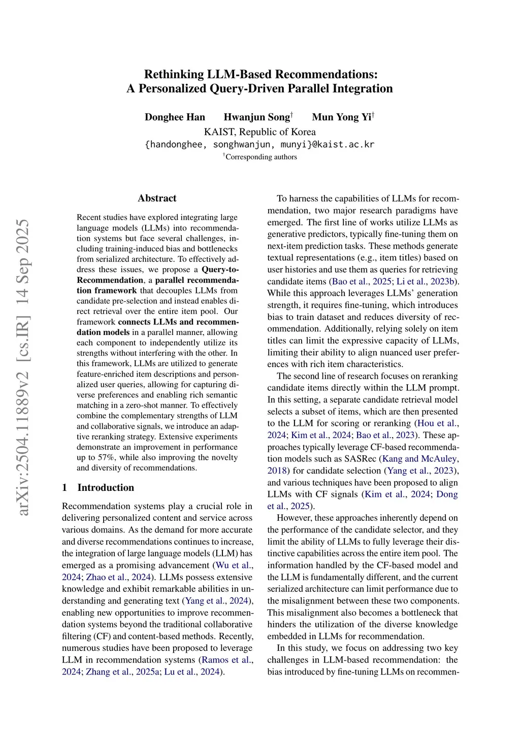 Rethinking LLM-Based Recommendations: A Personalized Query-Driven Parallel Integration