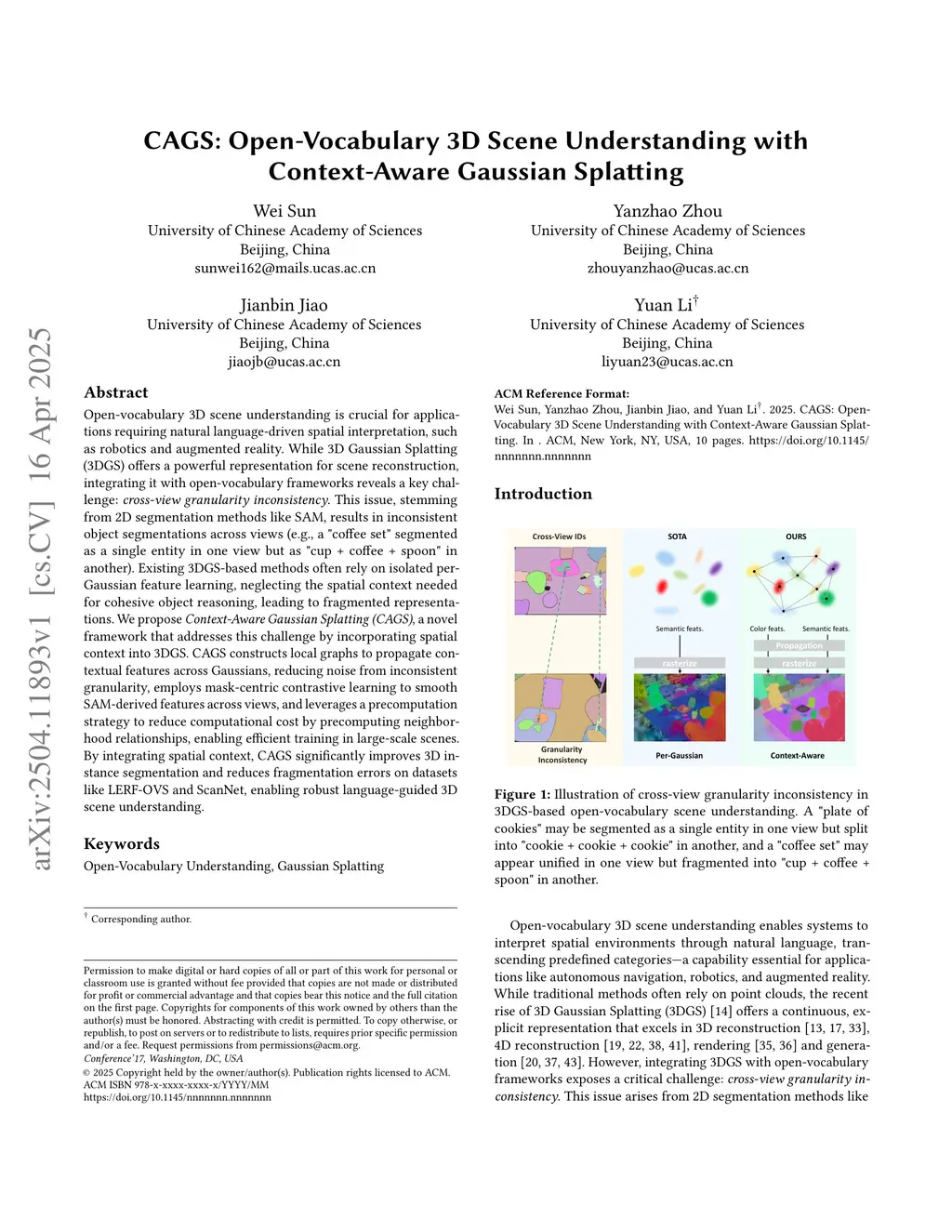 Open-vocabulary 3D scene understanding is crucial for applications requiring natural language-driven spatial interpretation, such as robotics and augmented reality. While 3D Gaussian Splatting (3DGS) offers a powerful representation for scene reconstruction, integrating it with open-vocabulary frameworks reveals a key challenge: cross-view granularity inconsistency. This issue, stemming from 2D segmentation methods like SAM, results in inconsistent object segmentations across views (e.g., a "coffee set" segmented as a single entity in one view but as "cup + coffee + spoon" in another). Existing 3DGS-based methods often rely on isolated per-Gaussian feature learning, neglecting the spatial context needed for cohesive object reasoning, leading to fragmented representations. We propose Context-Aware Gaussian Splatting (CAGS), a novel framework that addresses this challenge by incorporating spatial context into 3DGS. CAGS constructs local graphs to propagate contextual features across Gaussians, reducing noise from inconsistent granularity, employs mask-centric contrastive learning to smooth SAM-derived features across views, and leverages a precomputation strategy to reduce computational cost by precomputing neighborhood relationships, enabling efficient training in large-scale scenes. By integrating spatial context, CAGS significantly improves 3D instance segmentation and reduces fragmentation errors on datasets like LERF-OVS and ScanNet, enabling robust language-guided 3D scene understanding.