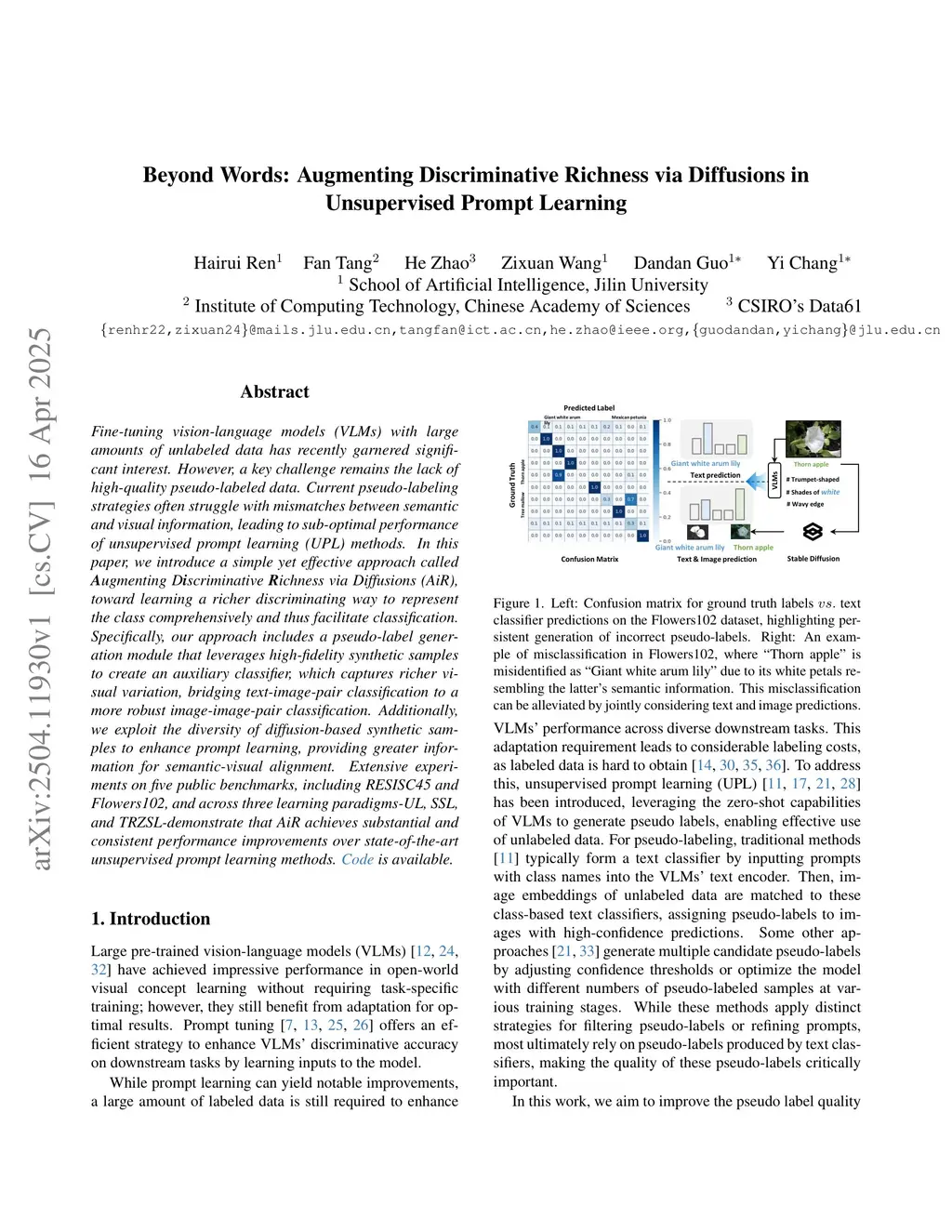 Fine-tuning vision-language models (VLMs) with large amounts of unlabeled data has recently garnered significant interest. However, a key challenge remains the lack of high-quality pseudo-labeled data. Current pseudo-labeling strategies often struggle with mismatches between semantic and visual information, leading to sub-optimal performance of unsupervised prompt learning (UPL) methods. In this paper, we introduce a simple yet effective approach called \textbf{A}ugmenting D\textbf{i}scriminative \textbf{R}ichness via Diffusions (AiR), toward learning a richer discriminating way to represent the class comprehensively and thus facilitate classification. Specifically, our approach includes a pseudo-label generation module that leverages high-fidelity synthetic samples to create an auxiliary classifier, which captures richer visual variation, bridging text-image-pair classification to a more robust image-image-pair classification. Additionally, we exploit the diversity of diffusion-based synthetic samples to enhance prompt learning, providing greater information for semantic-visual alignment. Extensive experiments on five public benchmarks, including RESISC45 and Flowers102, and across three learning paradigms-UL, SSL, and TRZSL-demonstrate that AiR achieves substantial and consistent performance improvements over state-of-the-art unsupervised prompt learning methods.