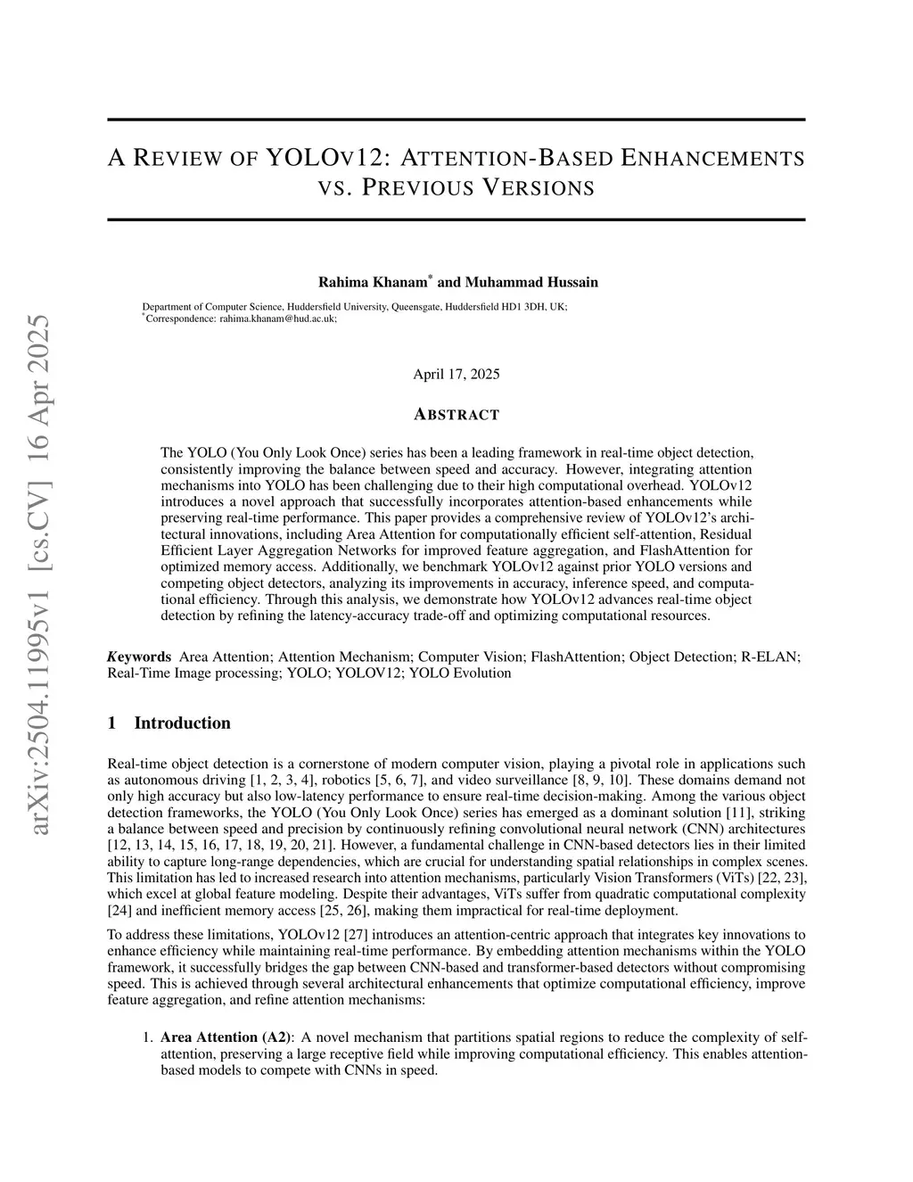 The YOLO (You Only Look Once) series has been a leading framework in real-time object detection, consistently improving the balance between speed and accuracy. However, integrating attention mechanisms into YOLO has been challenging due to their high computational overhead. YOLOv12 introduces a novel approach that successfully incorporates attention-based enhancements while preserving real-time performance. This paper provides a comprehensive review of YOLOv12's architectural innovations, including Area Attention for computationally efficient self-attention, Residual Efficient Layer Aggregation Networks for improved feature aggregation, and FlashAttention for optimized memory access. Additionally, we benchmark YOLOv12 against prior YOLO versions and competing object detectors, analyzing its improvements in accuracy, inference speed, and computational efficiency. Through this analysis, we demonstrate how YOLOv12 advances real-time object detection by refining the latency-accuracy trade-off and optimizing computational resources.