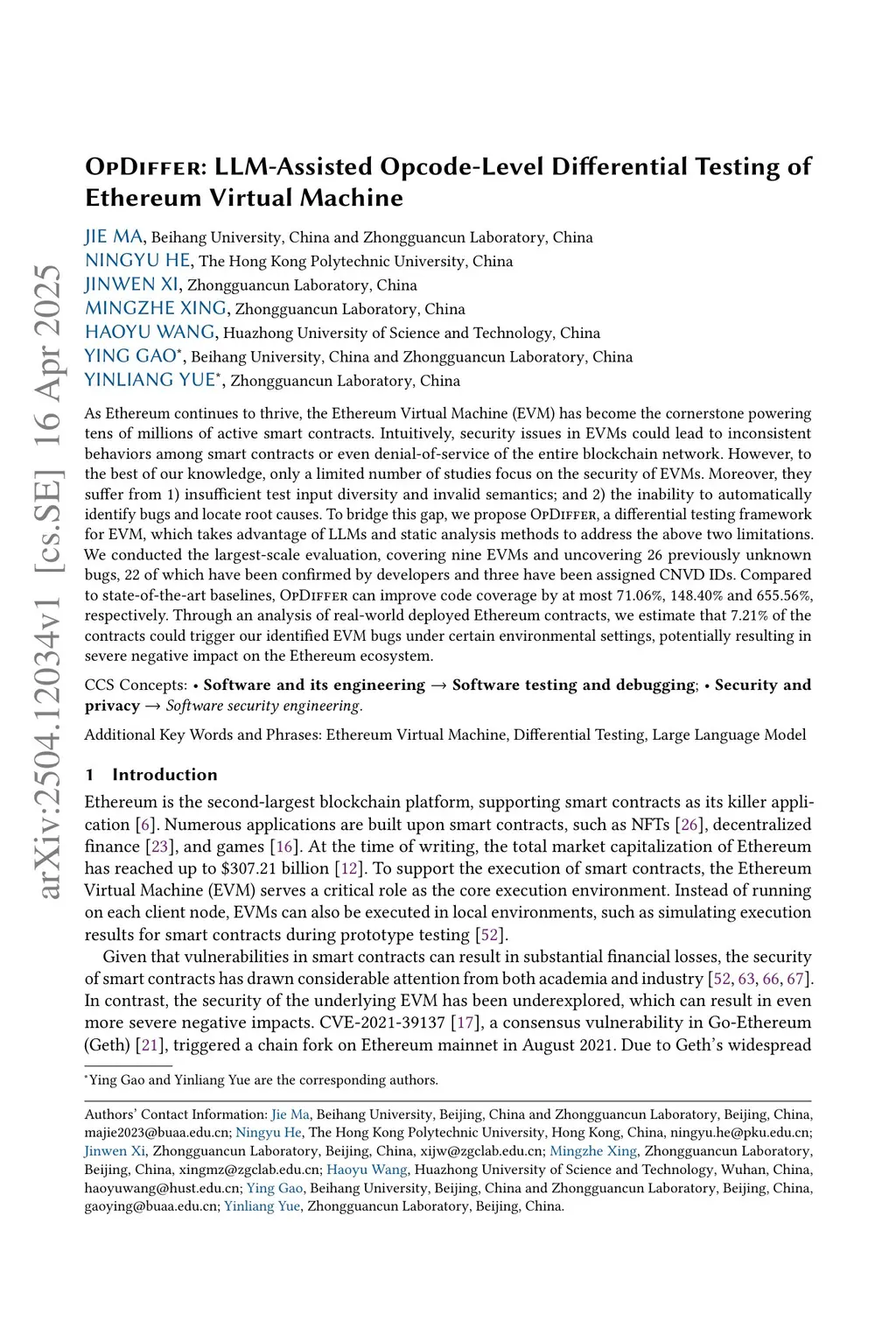 As Ethereum continues to thrive, the Ethereum Virtual Machine (EVM) has become the cornerstone powering tens of millions of active smart contracts. Intuitively, security issues in EVMs could lead to inconsistent behaviors among smart contracts or even denial-of-service of the entire blockchain network. However, to the best of our knowledge, only a limited number of studies focus on the security of EVMs. Moreover, they suffer from 1) insufficient test input diversity and invalid semantics; and 2) the inability to automatically identify bugs and locate root causes. To bridge this gap, we propose OpDiffer, a differential testing framework for EVM, which takes advantage of LLMs and static analysis methods to address the above two limitations. We conducted the largest-scale evaluation, covering nine EVMs and uncovering 26 previously unknown bugs, 22 of which have been confirmed by developers and three have been assigned CNVD IDs. Compared to state-of-the-art baselines, OpDiffer can improve code coverage by at most 71.06%, 148.40% and 655.56%, respectively. Through an analysis of real-world deployed Ethereum contracts, we estimate that 7.21% of the contracts could trigger our identified EVM bugs under certain environmental settings, potentially resulting in severe negative impact on the Ethereum ecosystem.