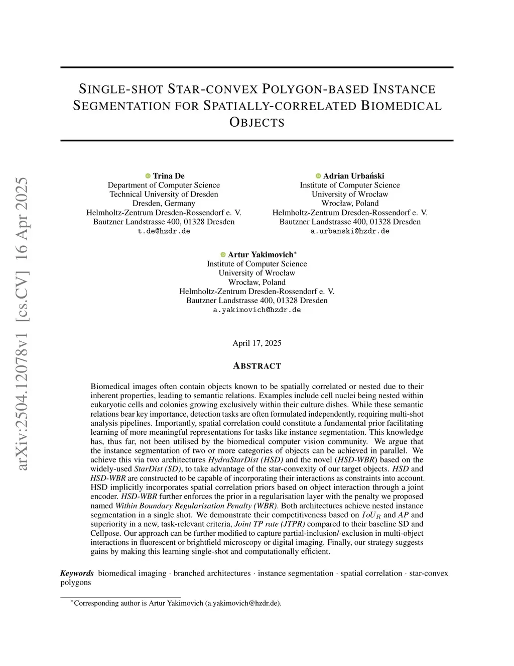 Biomedical images often contain objects known to be spatially correlated or nested due to their inherent properties, leading to semantic relations. Examples include cell nuclei being nested within eukaryotic cells and colonies growing exclusively within their culture dishes. While these semantic relations bear key importance, detection tasks are often formulated independently, requiring multi-shot analysis pipelines. Importantly, spatial correlation could constitute a fundamental prior facilitating learning of more meaningful representations for tasks like instance segmentation. This knowledge has, thus far, not been utilised by the biomedical computer vision community. We argue that the instance segmentation of two or more categories of objects can be achieved in parallel. We achieve this via two architectures HydraStarDist (HSD) and the novel (HSD-WBR) based on the widely-used StarDist (SD), to take advantage of the star-convexity of our target objects. HSD and HSD-WBR are constructed to be capable of incorporating their interactions as constraints into account. HSD implicitly incorporates spatial correlation priors based on object interaction through a joint encoder. HSD-WBR further enforces the prior in a regularisation layer with the penalty we proposed named Within Boundary Regularisation Penalty (WBR). Both architectures achieve nested instance segmentation in a single shot. We demonstrate their competitiveness based on and AP and superiority in a new, task-relevant criteria, Joint TP rate (JTPR) compared to their baseline SD and Cellpose. Our approach can be further modified to capture partial-inclusion/-exclusion in multi-object interactions in fluorescent or brightfield microscopy or digital imaging. Finally, our strategy suggests gains by making this learning single-shot and computationally efficient.