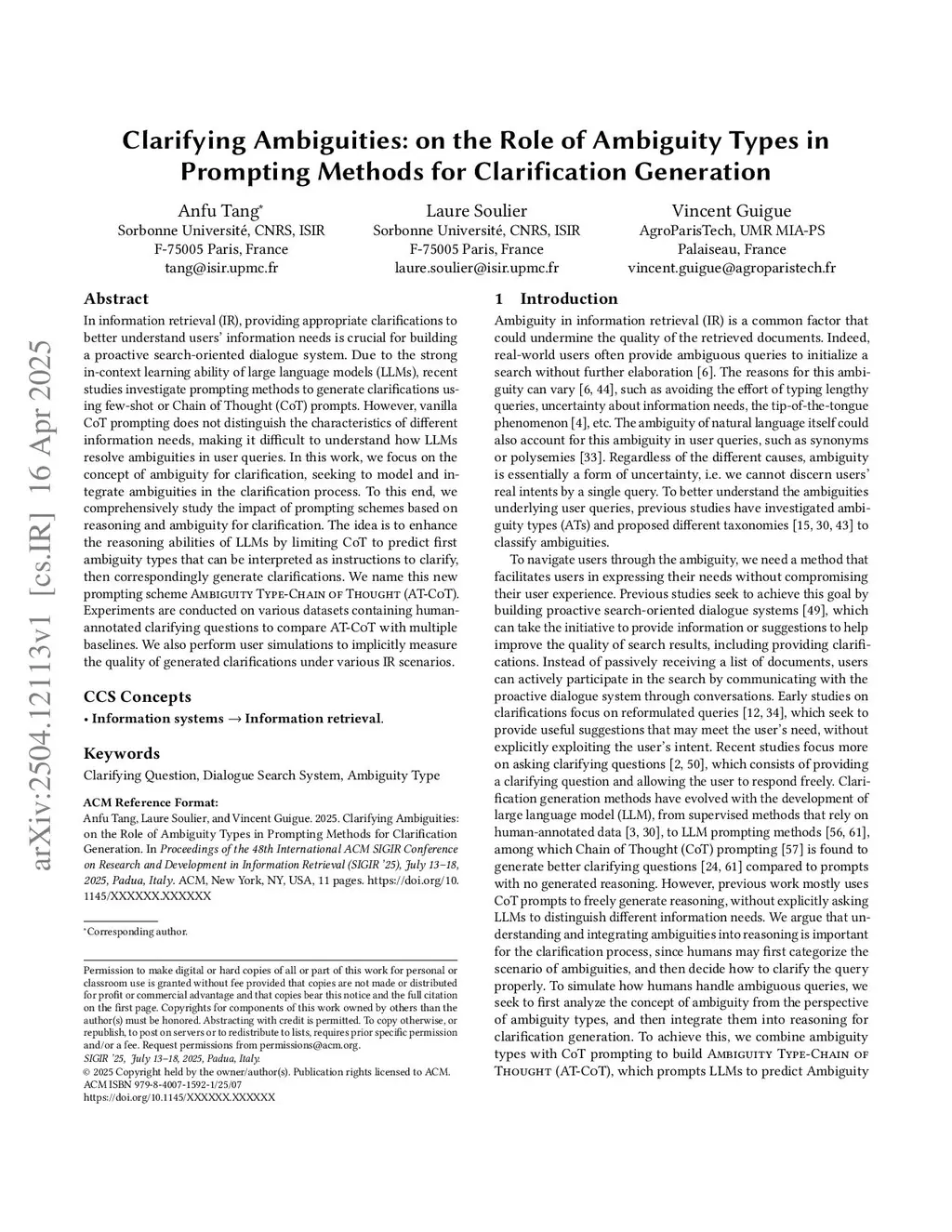 In information retrieval (IR), providing appropriate clarifications to better understand users' information needs is crucial for building a proactive search-oriented dialogue system. Due to the strong in-context learning ability of large language models (LLMs), recent studies investigate prompting methods to generate clarifications using few-shot or Chain of Thought (CoT) prompts. However, vanilla CoT prompting does not distinguish the characteristics of different information needs, making it difficult to understand how LLMs resolve ambiguities in user queries. In this work, we focus on the concept of ambiguity for clarification, seeking to model and integrate ambiguities in the clarification process. To this end, we comprehensively study the impact of prompting schemes based on reasoning and ambiguity for clarification. The idea is to enhance the reasoning abilities of LLMs by limiting CoT to predict first ambiguity types that can be interpreted as instructions to clarify, then correspondingly generate clarifications. We name this new prompting scheme Ambiguity Type-Chain of Thought (AT-CoT). Experiments are conducted on various datasets containing human-annotated clarifying questions to compare AT-CoT with multiple baselines. We also perform user simulations to implicitly measure the quality of generated clarifications under various IR scenarios.