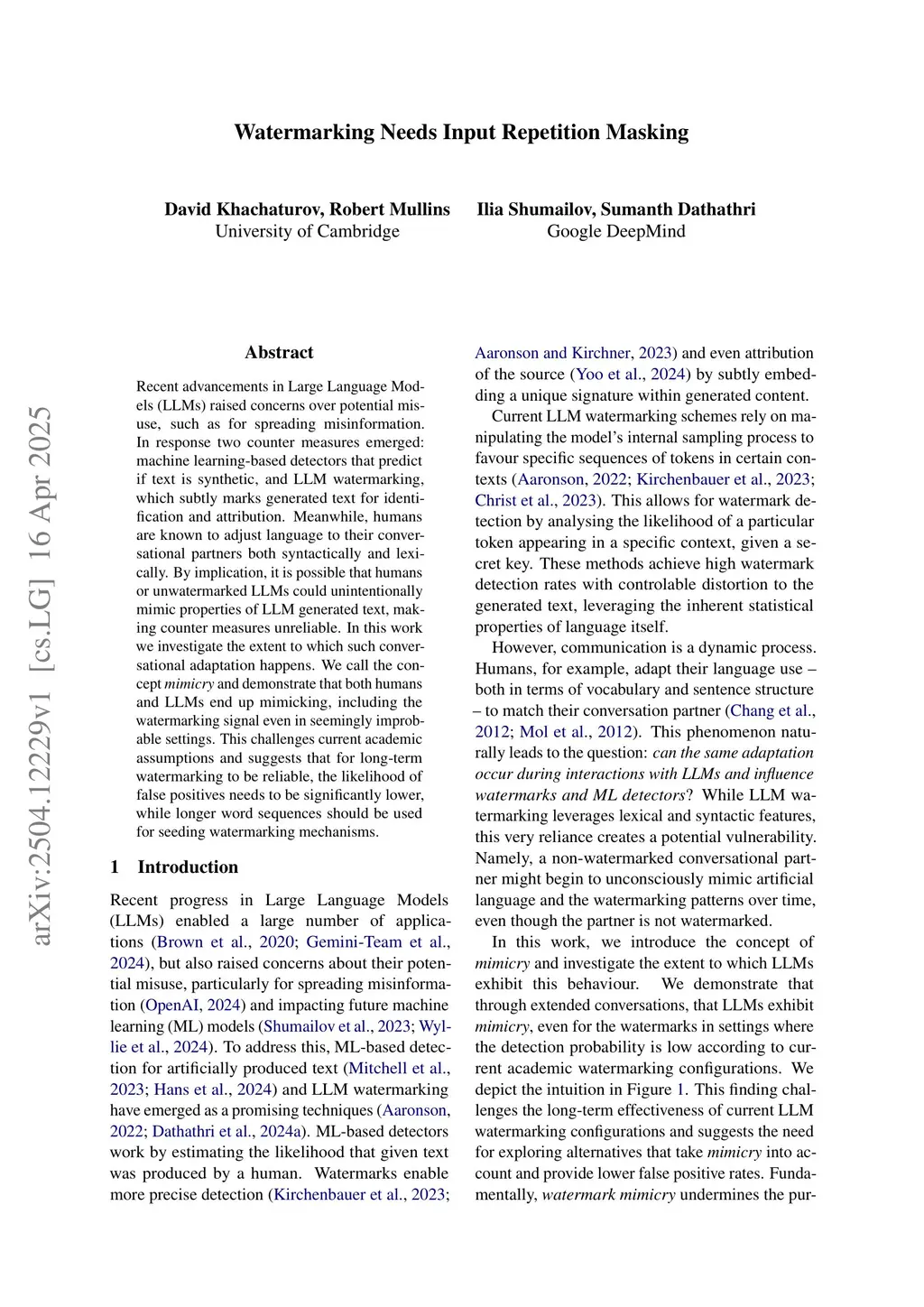Recent advancements in Large Language Models (LLMs) raised concerns over potential misuse, such as for spreading misinformation. In response two counter measures emerged: machine learning-based detectors that predict if text is synthetic, and LLM watermarking, which subtly marks generated text for identification and attribution. Meanwhile, humans are known to adjust language to their conversational partners both syntactically and lexically. By implication, it is possible that humans or unwatermarked LLMs could unintentionally mimic properties of LLM generated text, making counter measures unreliable. In this work we investigate the extent to which such conversational adaptation happens. We call the concept and demonstrate that both humans and LLMs end up mimicking, including the watermarking signal even in seemingly improbable settings. This challenges current academic assumptions and suggests that for long-term watermarking to be reliable, the likelihood of false positives needs to be significantly lower, while longer word sequences should be used for seeding watermarking mechanisms.