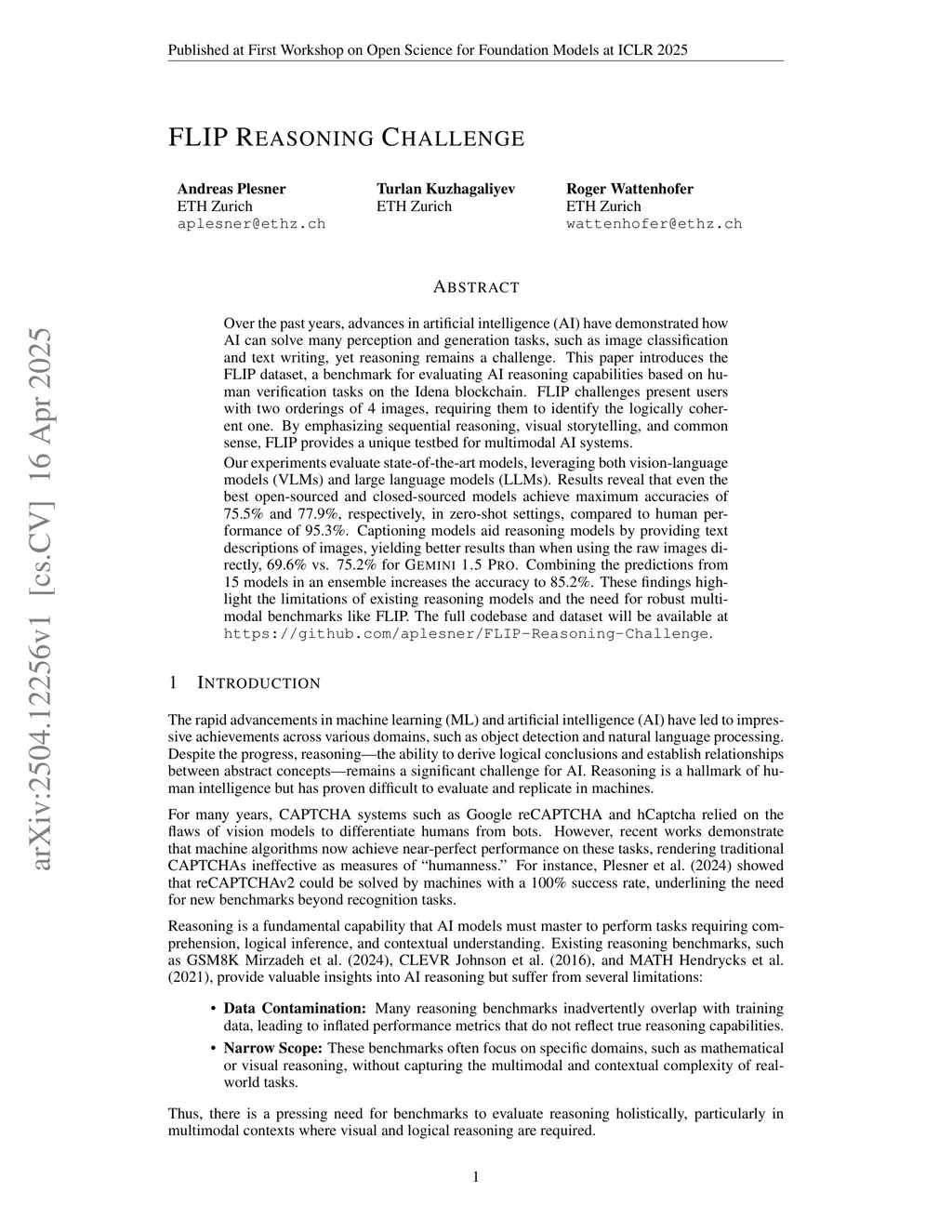 Over the past years, advances in artificial intelligence (AI) have demonstrated how AI can solve many perception and generation tasks, such as image classification and text writing, yet reasoning remains a challenge. This paper introduces the FLIP dataset, a benchmark for evaluating AI reasoning capabilities based on human verification tasks on the Idena blockchain. FLIP challenges present users with two orderings of 4 images, requiring them to identify the logically coherent one. By emphasizing sequential reasoning, visual storytelling, and common sense, FLIP provides a unique testbed for multimodal AI systems. Our experiments evaluate state-of-the-art models, leveraging both vision-language models (VLMs) and large language models (LLMs). Results reveal that even the best open-sourced and closed-sourced models achieve maximum accuracies of 75.5% and 77.9%, respectively, in zero-shot settings, compared to human performance of 95.3%. Captioning models aid reasoning models by providing text descriptions of images, yielding better results than when using the raw images directly, 69.6% vs. 75.2% for Gemini 1.5 Pro. Combining the predictions from 15 models in an ensemble increases the accuracy to 85.2%. These findings highlight the limitations of existing reasoning models and the need for robust multimodal benchmarks like FLIP. The full codebase and dataset will be available atthis https URL.
