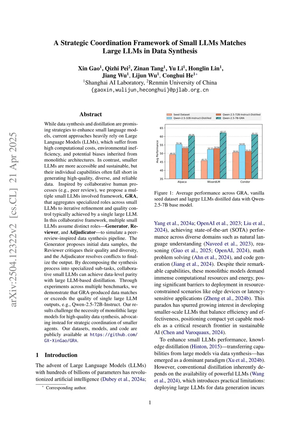 While data synthesis and distillation are promising strategies to enhance small language models, current approaches heavily rely on Large Language Models (LLMs), which suffer from high computational costs, environmental inefficiency, and potential biases inherited from monolithic architectures. In contrast, smaller LLMs are more accessible and sustainable, but their individual capabilities often fall short in generating high-quality, diverse, and reliable data. Inspired by collaborative human processes (e.g., peer review), we propose a multiple small LLMs involved framework, GRA, that aggregates specialized roles across small LLMs to iterative refinement and quality control typically achieved by a single large LLM. In this collaborative framework, multiple small LLMs assume distinct roles-Generator, Reviewer, and Adjudicator-to simulate a peer-review-inspired data synthesis pipeline. The Generator proposes initial data samples, the Reviewer critiques their quality and diversity, and the Adjudicator resolves conflicts to finalize the output. By decomposing the synthesis process into specialized sub-tasks, collaborative small LLMs can achieve data-level parity with large LLM-based distillation. Through experiments across multiple benchmarks, we demonstrate that GRA-produced data matches or exceeds the quality of single large LLM outputs, e.g., Qwen-2.5-72B-Instruct. Our results challenge the necessity of monolithic large models for high-quality data synthesis, advocating instead for strategic coordination of smaller agents. Our datasets, models, and code are publicly available atthis https URL.