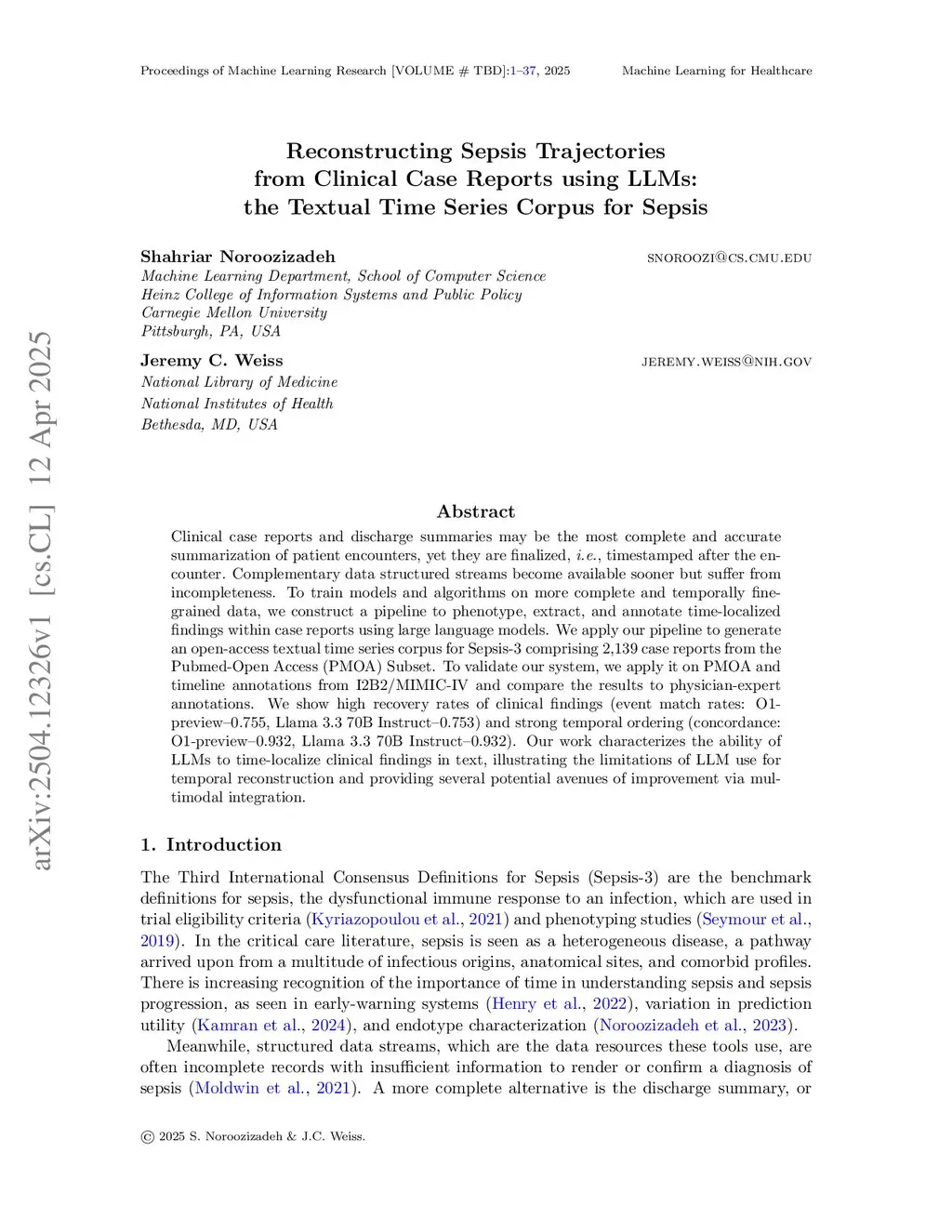 Clinical case reports and discharge summaries may be the most complete and accurate summarization of patient encounters, yet they are finalized, i.e., timestamped after the encounter. Complementary data structured streams become available sooner but suffer from incompleteness. To train models and algorithms on more complete and temporally fine-grained data, we construct a pipeline to phenotype, extract, and annotate time-localized findings within case reports using large language models. We apply our pipeline to generate an open-access textual time series corpus for Sepsis-3 comprising 2,139 case reports from the Pubmed-Open Access (PMOA) Subset. To validate our system, we apply it on PMOA and timeline annotations from I2B2/MIMIC-IV and compare the results to physician-expert annotations. We show high recovery rates of clinical findings (event match rates: O1-preview--0.755, Llama 3.3 70B Instruct--0.753) and strong temporal ordering (concordance: O1-preview--0.932, Llama 3.3 70B Instruct--0.932). Our work characterizes the ability of LLMs to time-localize clinical findings in text, illustrating the limitations of LLM use for temporal reconstruction and providing several potential avenues of improvement via multimodal integration.