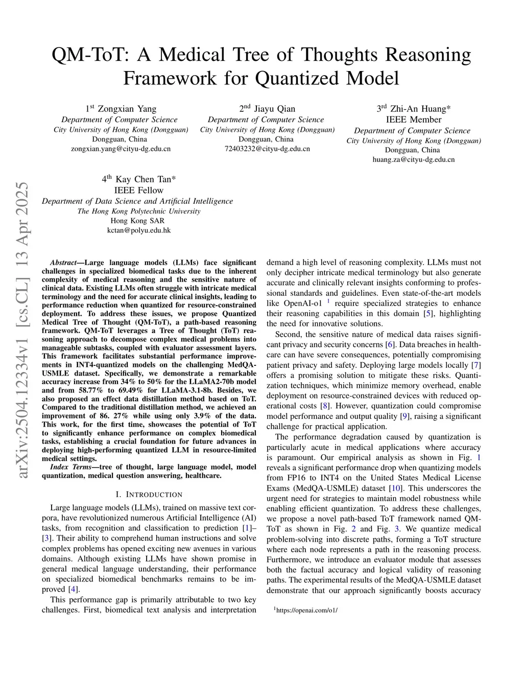 Large language models (LLMs) face significant challenges in specialized biomedical tasks due to the inherent complexity of medical reasoning and the sensitive nature of clinical data. Existing LLMs often struggle with intricate medical terminology and the need for accurate clinical insights, leading to performance reduction when quantized for resource-constrained deployment. To address these issues, we propose Quantized Medical Tree of Thought (QM-ToT), a path-based reasoning framework. QM-ToT leverages a Tree of Thought (ToT) reasoning approach to decompose complex medical problems into manageable subtasks, coupled with evaluator assessment layers. This framework facilitates substantial performance improvements in INT4-quantized models on the challenging MedQAUSMLE dataset. Specifically, we demonstrate a remarkable accuracy increase from 34% to 50% for the LLaMA2-70b model and from 58.77% to 69.49% for LLaMA-3.1-8b. Besides, we also proposed an effect data distillation method based on ToT. Compared to the traditional distillation method, we achieved an improvement of 86. 27% while using only 3.9% of thethis http URLwork, for the first time, showcases the potential of ToT to significantly enhance performance on complex biomedical tasks, establishing a crucial foundation for future advances in deploying high-performing quantized LLM in resource-limited medical settings.