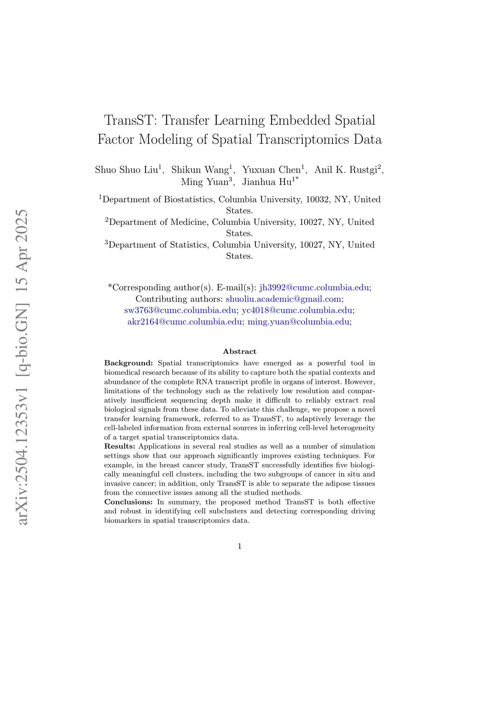 Background: Spatial transcriptomics have emerged as a powerful tool in biomedical research because of its ability to capture both the spatial contexts and abundance of the complete RNA transcript profile in organs of interest. However, limitations of the technology such as the relatively low resolution and comparatively insufficient sequencing depth make it difficult to reliably extract real biological signals from these data. To alleviate this challenge, we propose a novel transfer learning framework, referred to as TransST, to adaptively leverage the cell-labeled information from external sources in inferring cell-level heterogeneity of a target spatial transcriptomics data.Results: Applications in several real studies as well as a number of simulation settings show that our approach significantly improves existing techniques. For example, in the breast cancer study, TransST successfully identifies five biologically meaningful cell clusters, including the two subgroups of cancer in situ and invasive cancer; in addition, only TransST is able to separate the adipose tissues from the connective issues among all the studied methods.Conclusions: In summary, the proposed method TransST is both effective and robust in identifying cell subclusters and detecting corresponding driving biomarkers in spatial transcriptomics data.