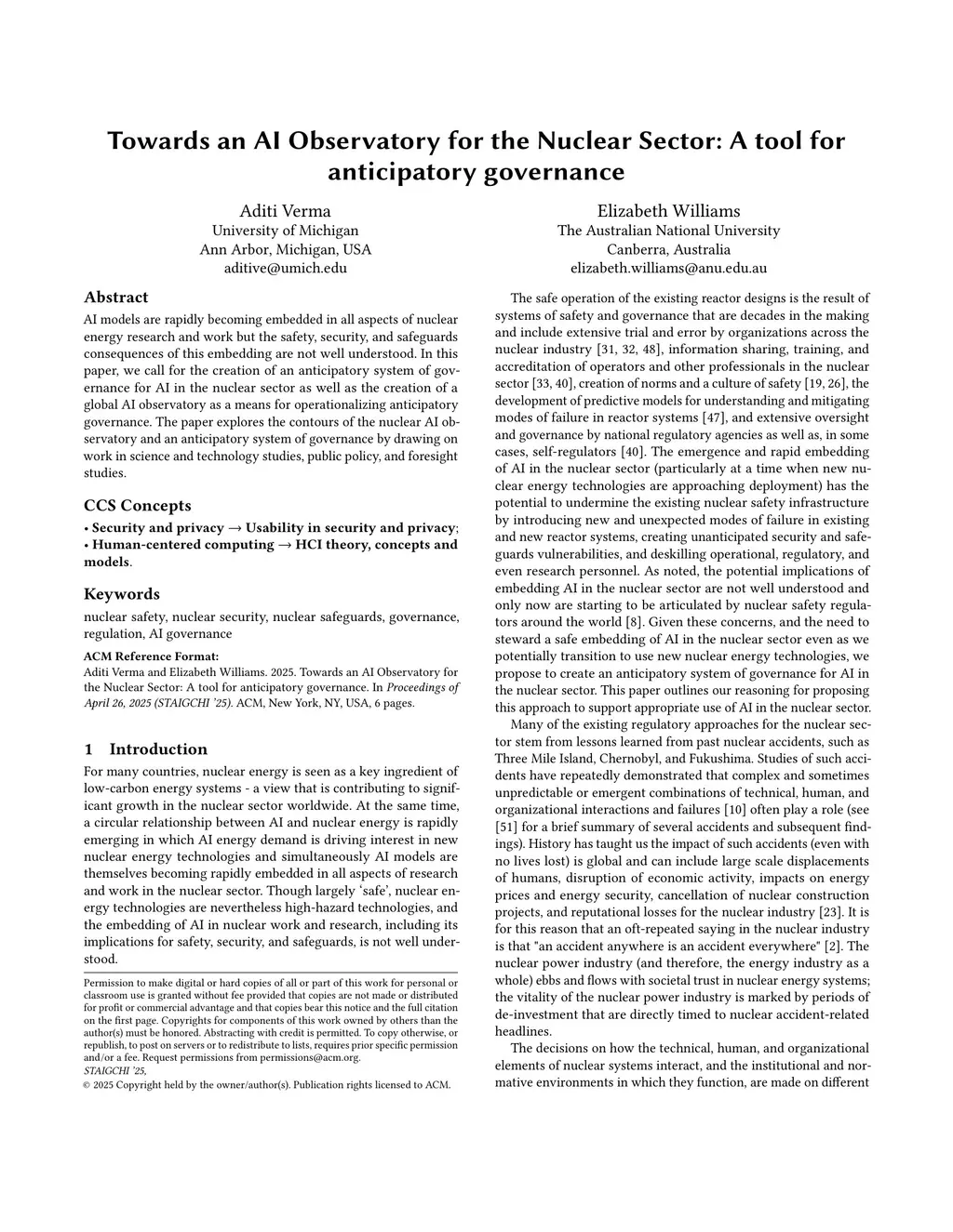 AI models are rapidly becoming embedded in all aspects of nuclear energy research and work but the safety, security, and safeguards consequences of this embedding are not well understood. In this paper, we call for the creation of an anticipatory system of governance for AI in the nuclear sector as well as the creation of a global AI observatory as a means for operationalizing anticipatory governance. The paper explores the contours of the nuclear AI observatory and an anticipatory system of governance by drawing on work in science and technology studies, public policy, and foresight studies.
