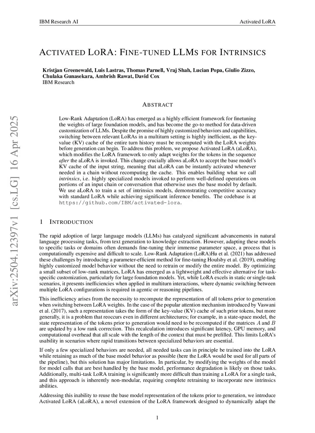 Low-Rank Adaptation (LoRA) has emerged as a highly efficient framework for finetuning the weights of large foundation models, and has become the go-to method for data-driven customization of LLMs. Despite the promise of highly customized behaviors and capabilities, switching between relevant LoRAs in a multiturn setting is inefficient, as the key-value (KV) cache of the entire turn history must be recomputed with the LoRA weights before generation can begin. To address this problem, we propose Activated LoRA (aLoRA), an adapter architecture which modifies the LoRA framework to only adapt weights for the tokens in the sequence after the aLoRA is invoked. This change crucially allows aLoRA to accept the base model's KV cache of the input string, meaning that aLoRA can be instantly activated whenever needed in a chain without recomputing the prior keys and values. This enables building what we call intrinsics, i.e. specialized models invoked to perform well-defined operations on portions of an input chain or conversation that otherwise uses the base model by default. We train a set of aLoRA-based intrinsics models, demonstrating competitive accuracy with standard LoRA while significantly improving inference efficiency. We contributed our Activated LoRA implementation to the Huggingface PEFT librarythis https URL.
