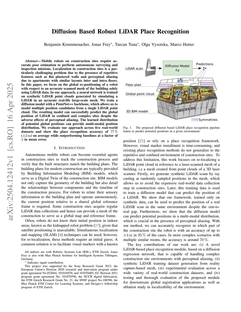 Mobile robots on construction sites require accurate pose estimation to perform autonomous surveying and inspection missions. Localization in construction sites is a particularly challenging problem due to the presence of repetitive features such as flat plastered walls and perceptual aliasing due to apartments with similar layouts inter and intra floors. In this paper, we focus on the global re-positioning of a robot with respect to an accurate scanned mesh of the building solely using LiDAR data. In our approach, a neural network is trained on synthetic LiDAR point clouds generated by simulating a LiDAR in an accurate real-life large-scale mesh. We train a diffusion model with a PointNet++ backbone, which allows us to model multiple position candidates from a single LiDAR point cloud. The resulting model can successfully predict the global position of LiDAR in confined and complex sites despite the adverse effects of perceptual aliasing. The learned distribution of potential global positions can provide multi-modal position distribution. We evaluate our approach across five real-world datasets and show the place recognition accuracy of 77% +/-2m on average while outperforming baselines at a factor of 2 in mean error.