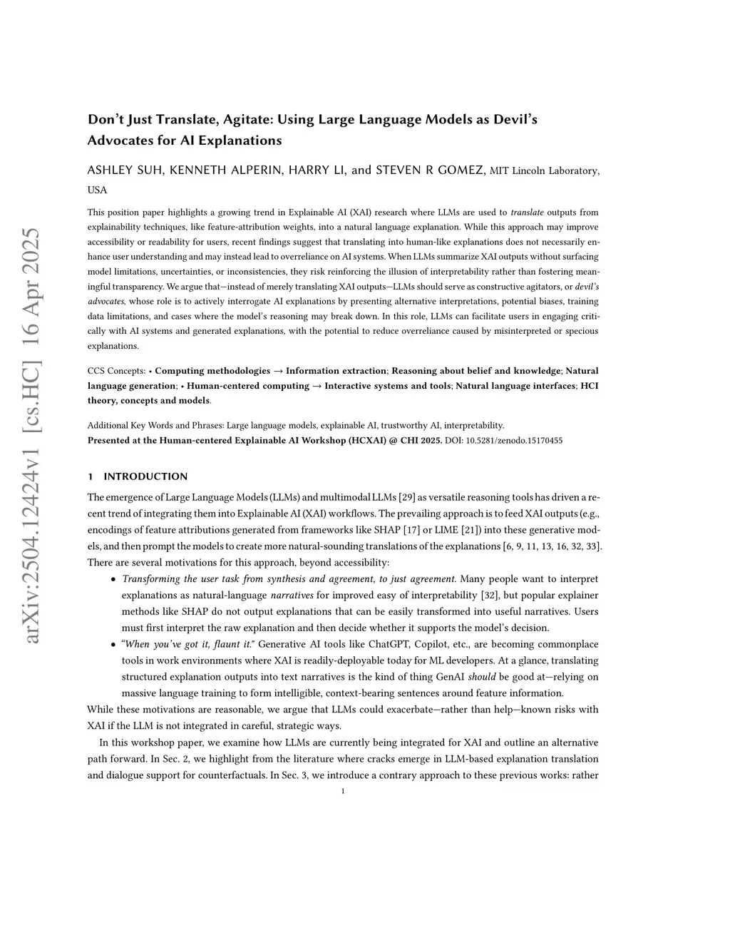 This position paper highlights a growing trend in Explainable AI (XAI) research where Large Language Models (LLMs) are used to translate outputs from explainability techniques, like feature-attribution weights, into a natural language explanation. While this approach may improve accessibility or readability for users, recent findings suggest that translating into human-like explanations does not necessarily enhance user understanding and may instead lead to overreliance on AI systems. When LLMs summarize XAI outputs without surfacing model limitations, uncertainties, or inconsistencies, they risk reinforcing the illusion of interpretability rather than fostering meaningful transparency. We argue that - instead of merely translating XAI outputs - LLMs should serve as constructive agitators, or devil's advocates, whose role is to actively interrogate AI explanations by presenting alternative interpretations, potential biases, training data limitations, and cases where the model's reasoning may break down. In this role, LLMs can facilitate users in engaging critically with AI systems and generated explanations, with the potential to reduce overreliance caused by misinterpreted or specious explanations.