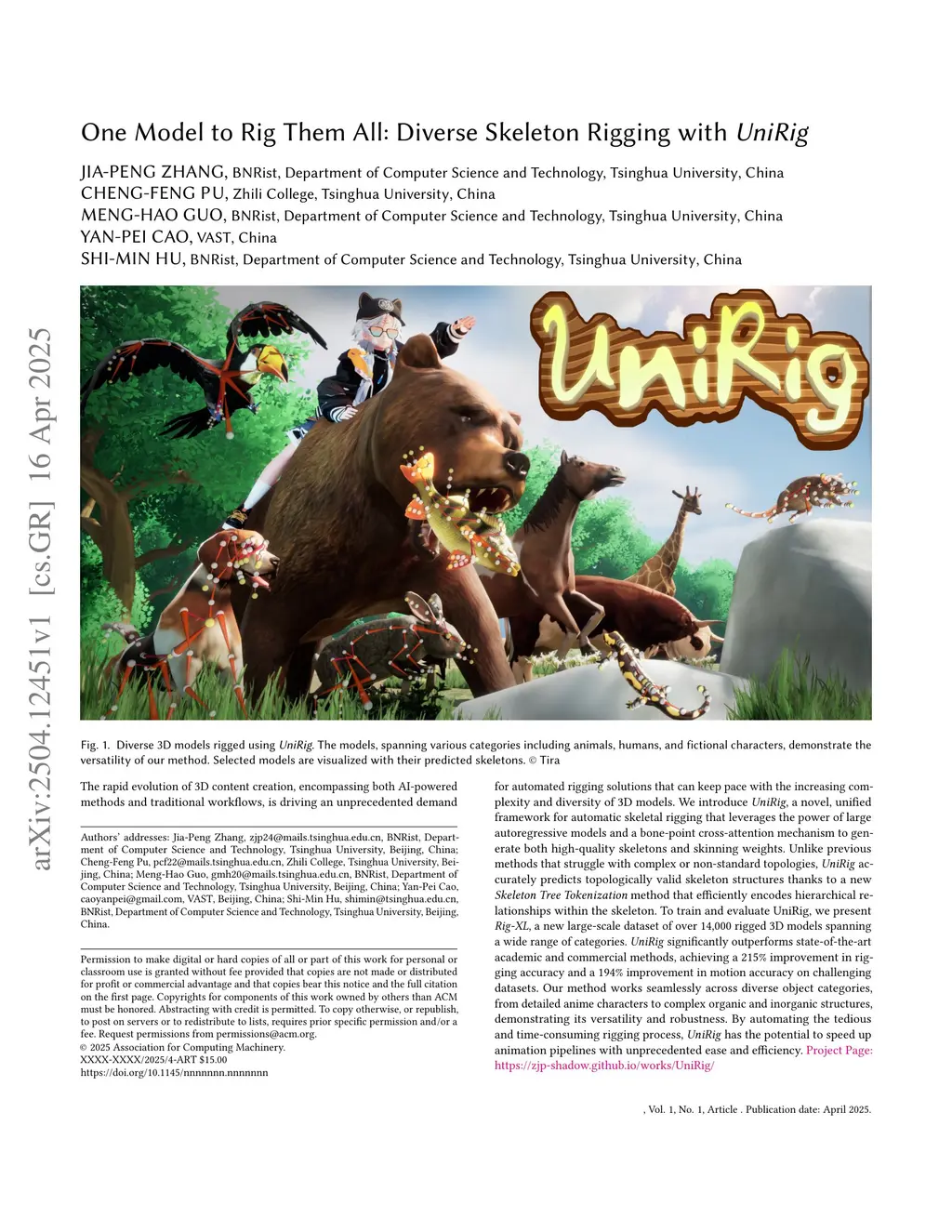 The rapid evolution of 3D content creation, encompassing both AI-powered methods and traditional workflows, is driving an unprecedented demand for automated rigging solutions that can keep pace with the increasing complexity and diversity of 3D models. We introduce UniRig, a novel, unified framework for automatic skeletal rigging that leverages the power of large autoregressive models and a bone-point cross-attention mechanism to generate both high-quality skeletons and skinning weights. Unlike previous methods that struggle with complex or non-standard topologies, UniRig accurately predicts topologically valid skeleton structures thanks to a new Skeleton Tree Tokenization method that efficiently encodes hierarchical relationships within the skeleton. To train and evaluate UniRig, we present Rig-XL, a new large-scale dataset of over 14,000 rigged 3D models spanning a wide range of categories. UniRig significantly outperforms state-of-the-art academic and commercial methods, achieving a 215% improvement in rigging accuracy and a 194% improvement in motion accuracy on challenging datasets. Our method works seamlessly across diverse object categories, from detailed anime characters to complex organic and inorganic structures, demonstrating its versatility and robustness. By automating the tedious and time-consuming rigging process, UniRig has the potential to speed up animation pipelines with unprecedented ease and efficiency. Project Page:this https URL