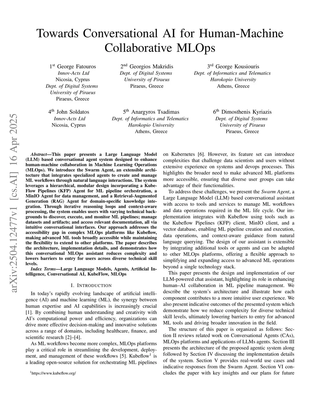 This paper presents a Large Language Model (LLM) based conversational agent system designed to enhance human-machine collaboration in Machine Learning Operations (MLOps). We introduce the Swarm Agent, an extensible architecture that integrates specialized agents to create and manage ML workflows through natural language interactions. The system leverages a hierarchical, modular design incorporating a KubeFlow Pipelines (KFP) Agent for ML pipeline orchestration, a MinIO Agent for data management, and a Retrieval-Augmented Generation (RAG) Agent for domain-specific knowledge integration. Through iterative reasoning loops and context-aware processing, the system enables users with varying technical backgrounds to discover, execute, and monitor ML pipelines; manage datasets and artifacts; and access relevant documentation, all via intuitive conversational interfaces. Our approach addresses the accessibility gap in complex MLOps platforms like Kubeflow, making advanced ML tools broadly accessible while maintaining the flexibility to extend to other platforms. The paper describes the architecture, implementation details, and demonstrates how this conversational MLOps assistant reduces complexity and lowers barriers to entry for users across diverse technical skill levels.