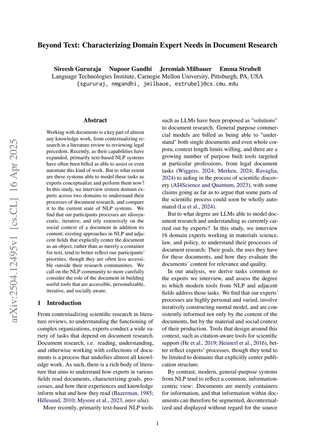 Working with documents is a key part of almost any knowledge work, from contextualizing research in a literature review to reviewing legal precedent. Recently, as their capabilities have expanded, primarily text-based NLP systems have often been billed as able to assist or even automate this kind of work. But to what extent are these systems able to model these tasks as experts conceptualize and perform them now? In this study, we interview sixteen domain experts across two domains to understand their processes of document research, and compare it to the current state of NLP systems. We find that our participants processes are idiosyncratic, iterative, and rely extensively on the social context of a document in addition its content; existing approaches in NLP and adjacent fields that explicitly center the document as an object, rather than as merely a container for text, tend to better reflect our participants' priorities, though they are often less accessible outside their research communities. We call on the NLP community to more carefully consider the role of the document in building useful tools that are accessible, personalizable, iterative, and socially aware.
