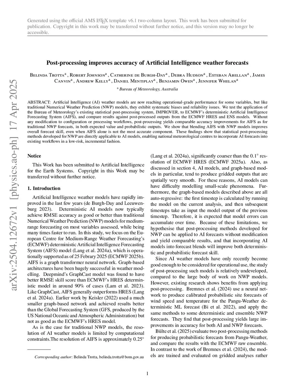 Artificial Intelligence (AI) weather models are now reaching operational-grade performance for some variables, but like traditional Numerical Weather Prediction (NWP) models, they exhibit systematic biases and reliability issues. We test the application of the Bureau of Meteorology's existing statistical post-processing system, IMPROVER, to ECMWF's deterministic Artificial Intelligence Forecasting System (AIFS), and compare results against post-processed outputs from the ECMWF HRES and ENS models. Without any modification to processing workflows, post-processing yields comparable accuracy improvements for AIFS as for traditional NWP forecasts, in both expected value and probabilistic outputs. We show that blending AIFS with NWP models improves overall forecast skill, even when AIFS alone is not the most accurate component. These findings show that statistical post-processing methods developed for NWP are directly applicable to AI models, enabling national meteorological centres to incorporate AI forecasts into existing workflows in a low-risk, incremental fashion.