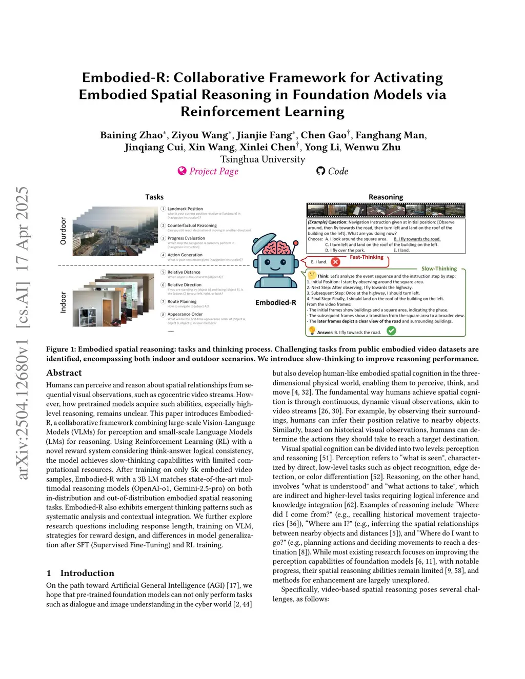 Humans can perceive and reason about spatial relationships from sequential visual observations, such as egocentric video streams. However, how pretrained models acquire such abilities, especially high-level reasoning, remains unclear. This paper introduces Embodied-R, a collaborative framework combining large-scale Vision-Language Models (VLMs) for perception and small-scale Language Models (LMs) for reasoning. Using Reinforcement Learning (RL) with a novel reward system considering think-answer logical consistency, the model achieves slow-thinking capabilities with limited computational resources. After training on only 5k embodied video samples, Embodied-R with a 3B LM matches state-of-the-art multimodal reasoning models (OpenAI-o1, Gemini-2.5-pro) on both in-distribution and out-of-distribution embodied spatial reasoning tasks. Embodied-R also exhibits emergent thinking patterns such as systematic analysis and contextual integration. We further explore research questions including response length, training on VLM, strategies for reward design, and differences in model generalization after SFT (Supervised Fine-Tuning) and RL training.