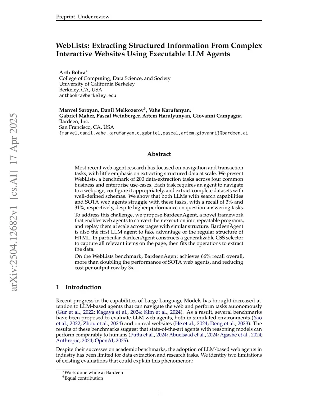Most recent web agent research has focused on navigation and transaction tasks, with little emphasis on extracting structured data at scale. We present WebLists, a benchmark of 200 data-extraction tasks across four common business and enterprise use-cases. Each task requires an agent to navigate to a webpage, configure it appropriately, and extract complete datasets with well-defined schemas. We show that both LLMs with search capabilities and SOTA web agents struggle with these tasks, with a recall of 3% and 31%, respectively, despite higher performance on question-answering tasks.To address this challenge, we propose BardeenAgent, a novel framework that enables web agents to convert their execution into repeatable programs, and replay them at scale across pages with similar structure. BardeenAgent is also the first LLM agent to take advantage of the regular structure of HTML. In particular BardeenAgent constructs a generalizable CSS selector to capture all relevant items on the page, then fits the operations to extract the data.On the WebLists benchmark, BardeenAgent achieves 66% recall overall, more than doubling the performance of SOTA web agents, and reducing cost per output row by 3x.
