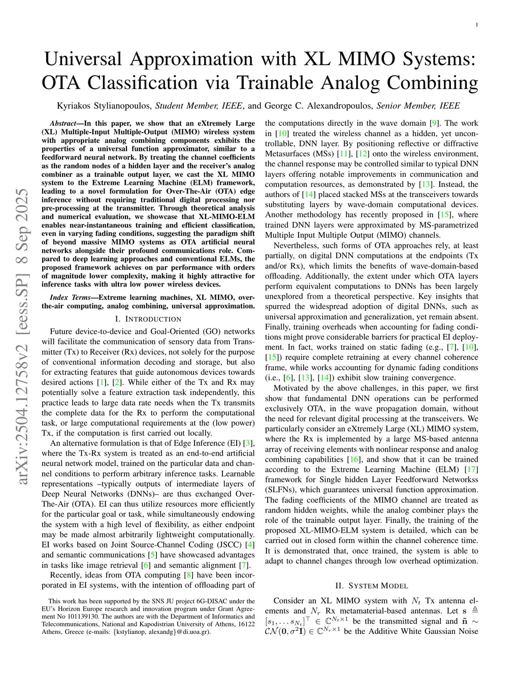 In this paper, we show that an eXtremely Large (XL) Multiple-Input Multiple-Output (MIMO) wireless system with appropriate analog combining components exhibits the properties of a universal function approximator, similar to a feedforward neural network. By treating the channel coefficients as the random nodes of a hidden layer and the receiver's analog combiner as a trainable output layer, we cast the XL MIMO system to the Extreme Learning Machine (ELM) framework, leading to a novel formulation for Over-The-Air (OTA) edge inference without requiring traditional digital processing nor pre-processing at the transmitter. Through theoretical analysis and numerical evaluation, we showcase that XL-MIMO-ELM enables near-instantaneous training and efficient classification, even in varying fading conditions, suggesting the paradigm shift of beyond massive MIMO systems as OTA artificial neural networks alongside their profound communications role. Compared to deep learning approaches and conventional ELMs, the proposed framework achieves on par performance with orders of magnitude lower complexity, making it highly attractive for inference tasks with ultra low power wireless devices.