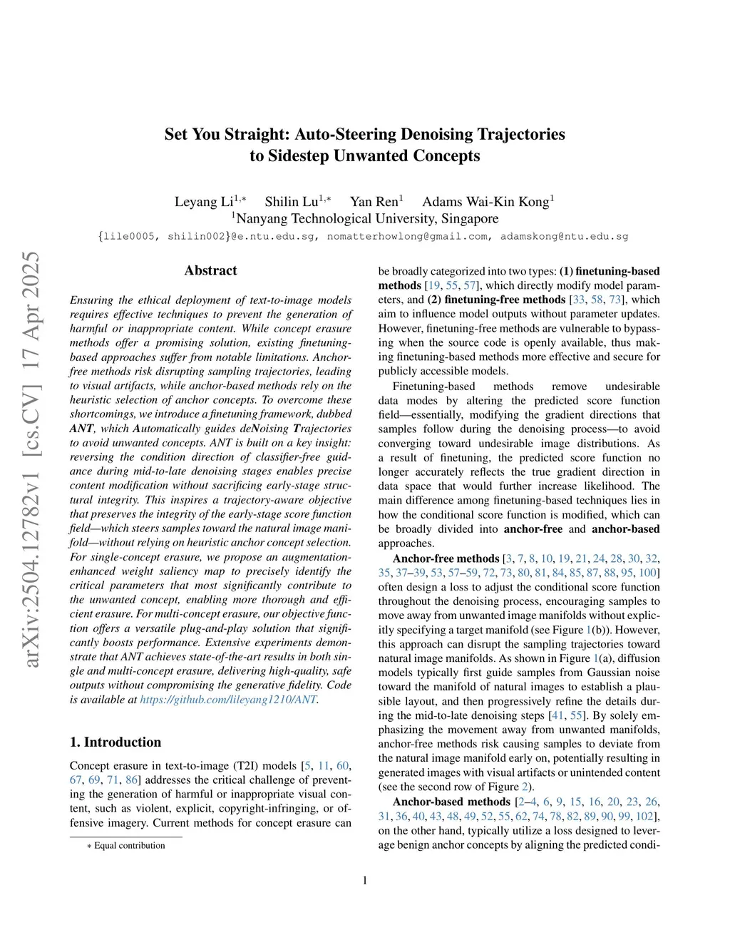 Ensuring the ethical deployment of text-to-image models requires effective techniques to prevent the generation of harmful or inappropriate content. While concept erasure methods offer a promising solution, existing finetuning-based approaches suffer from notable limitations. Anchor-free methods risk disrupting sampling trajectories, leading to visual artifacts, while anchor-based methods rely on the heuristic selection of anchor concepts. To overcome these shortcomings, we introduce a finetuning framework, dubbed ANT, which Automatically guides deNoising Trajectories to avoid unwanted concepts. ANT is built on a key insight: reversing the condition direction of classifier-free guidance during mid-to-late denoising stages enables precise content modification without sacrificing early-stage structural integrity. This inspires a trajectory-aware objective that preserves the integrity of the early-stage score function field, which steers samples toward the natural image manifold, without relying on heuristic anchor concept selection. For single-concept erasure, we propose an augmentation-enhanced weight saliency map to precisely identify the critical parameters that most significantly contribute to the unwanted concept, enabling more thorough and efficient erasure. For multi-concept erasure, our objective function offers a versatile plug-and-play solution that significantly boosts performance. Extensive experiments demonstrate that ANT achieves state-of-the-art results in both single and multi-concept erasure, delivering high-quality, safe outputs without compromising the generative fidelity. Code is available atthis https URL