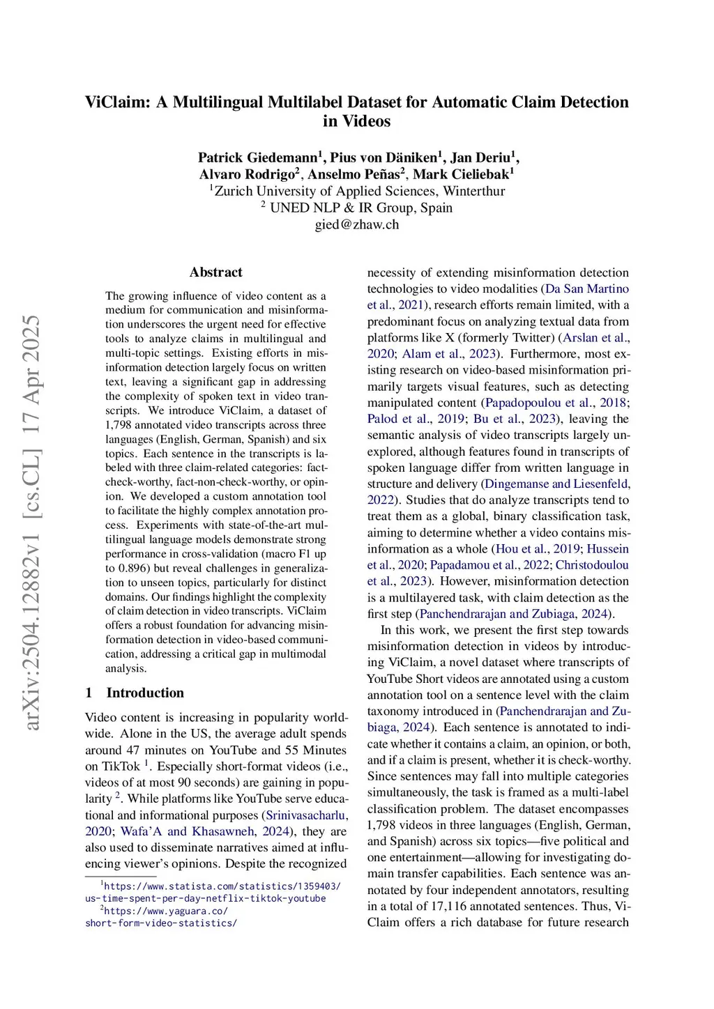 ViClaim: A Multilingual Multilabel Dataset for Automatic Claim Detection in Videos