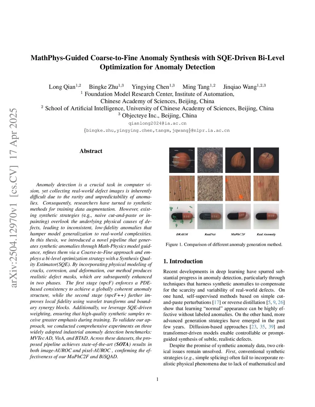 Currently, industrial anomaly detection suffers from two bottlenecks: (i) the rarity of real-world defect images and (ii) the opacity of sample quality when synthetic data are used. Existing synthetic strategies (e.g., cut-and-paste) overlook the underlying physical causes of defects, leading to inconsistent, low-fidelity anomalies that hamper model generalization to real-world complexities. In this paper, we introduce a novel and lightweight pipeline that generates synthetic anomalies through Math-Phys model guidance, refines them via a Coarse-to-Fine approach and employs a bi-level optimization strategy with a Synthesis Quality Estimator (SQE). By combining physical modeling of the three most typical physics-driven defect mechanisms: Fracture Line (FL), Pitting Loss (PL), and Plastic Warpage (PW), our method produces realistic defect masks, which are subsequently enhanced in two phases. The first stage (npcF) enforces a PDE-based consistency to achieve a globally coherent anomaly structure, while the second stage (npcF++) further improves local fidelity. Additionally, we leverage SQE-driven weighting, ensuring that high-quality synthetic samples receive greater emphasis during training. To validate our method, we conduct experiments on three anomaly detection benchmarks: MVTec AD, VisA, and BTAD. Across these datasets, our method achieves state-of-the-art results in both image- and pixel-AUROC, confirming the effectiveness of our MaPhC2F dataset and BiSQAD method. All code will be released.