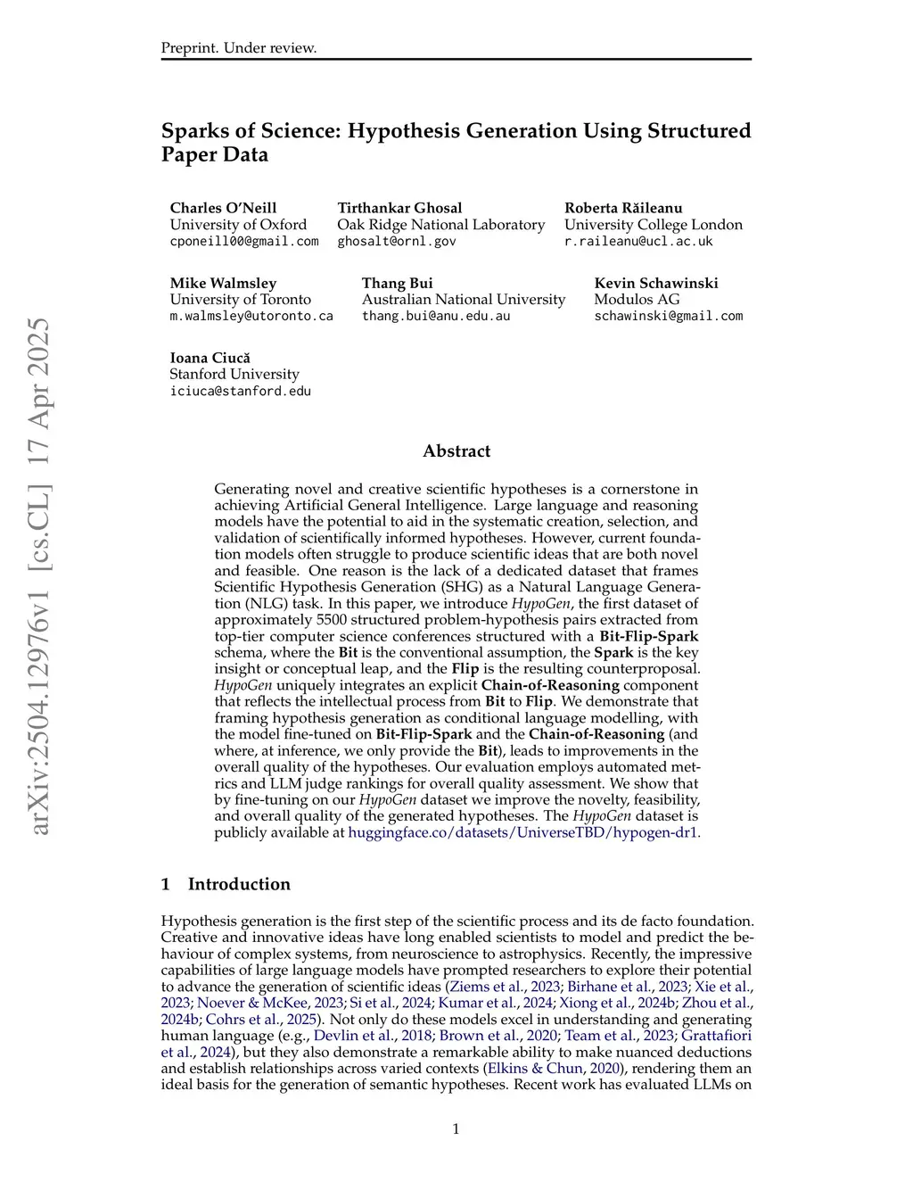 Generating novel and creative scientific hypotheses is a cornerstone in achieving Artificial General Intelligence. Large language and reasoning models have the potential to aid in the systematic creation, selection, and validation of scientifically informed hypotheses. However, current foundation models often struggle to produce scientific ideas that are both novel and feasible. One reason is the lack of a dedicated dataset that frames Scientific Hypothesis Generation (SHG) as a Natural Language Generation (NLG) task. In this paper, we introduce HypoGen, the first dataset of approximately 5500 structured problem-hypothesis pairs extracted from top-tier computer science conferences structured with a Bit-Flip-Spark schema, where the Bit is the conventional assumption, the Spark is the key insight or conceptual leap, and the Flip is the resulting counterproposal. HypoGen uniquely integrates an explicit Chain-of-Reasoning component that reflects the intellectual process from Bit to Flip. We demonstrate that framing hypothesis generation as conditional language modelling, with the model fine-tuned on Bit-Flip-Spark and the Chain-of-Reasoning (and where, at inference, we only provide the Bit), leads to improvements in the overall quality of the hypotheses. Our evaluation employs automated metrics and LLM judge rankings for overall quality assessment. We show that by fine-tuning on our HypoGen dataset we improve the novelty, feasibility, and overall quality of the generated hypotheses. The HypoGen dataset is publicly available atthis http URL.