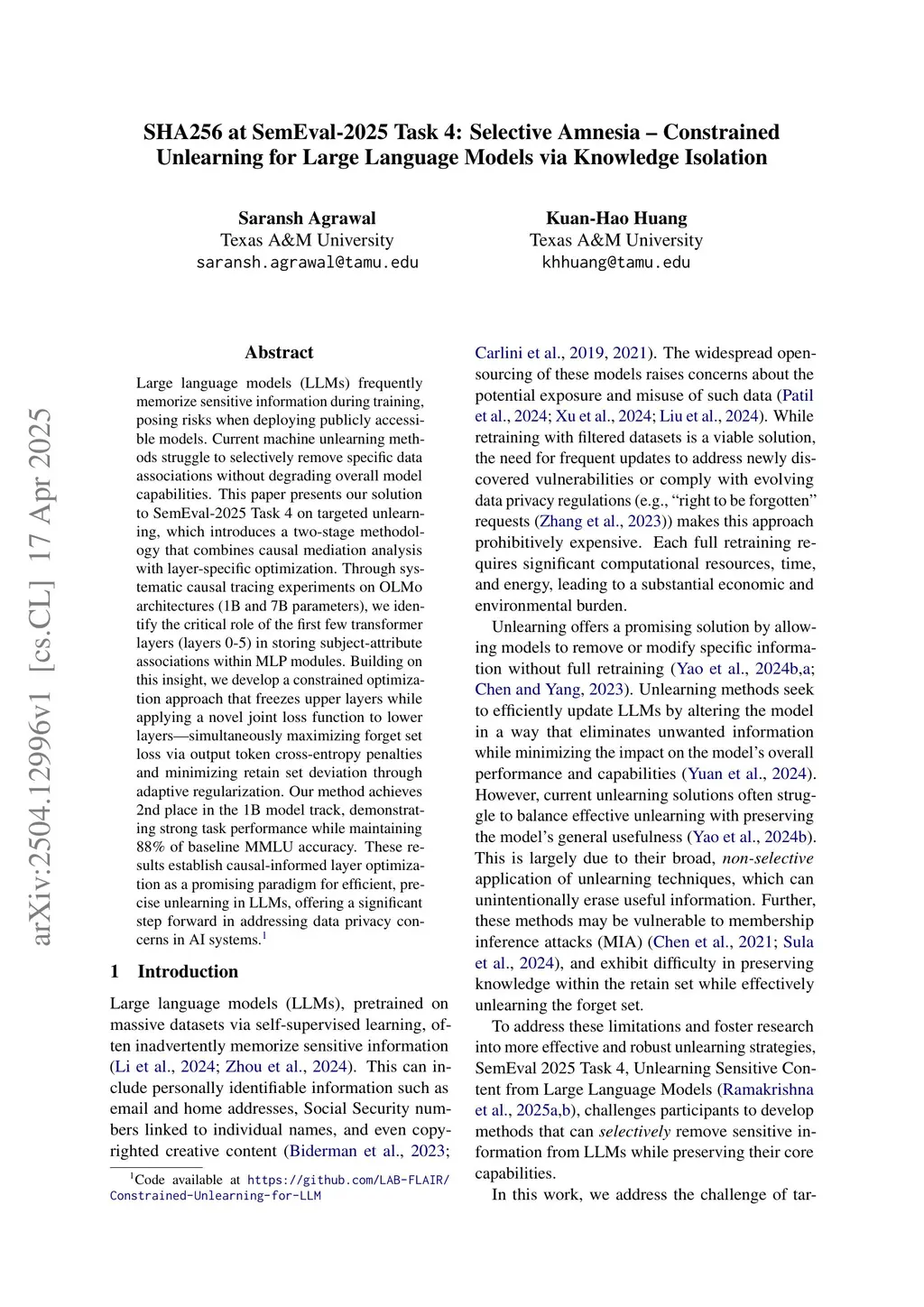 Large language models (LLMs) frequently memorize sensitive information during training, posing risks when deploying publicly accessible models. Current machine unlearning methods struggle to selectively remove specific data associations without degrading overall model capabilities. This paper presents our solution to SemEval-2025 Task 4 on targeted unlearning, which introduces a two-stage methodology that combines causal mediation analysis with layer-specific optimization. Through systematic causal tracing experiments on OLMo architectures (1B and 7B parameters), we identify the critical role of the first few transformer layers (layers 0-5) in storing subject-attribute associations within MLP modules. Building on this insight, we develop a constrained optimization approach that freezes upper layers while applying a novel joint loss function to lower layers-simultaneously maximizing forget set loss via output token cross-entropy penalties and minimizing retain set deviation through adaptive regularization. Our method achieves 2nd place in the 1B model track, demonstrating strong task performance while maintaining 88% of baseline MMLU accuracy. These results establish causal-informed layer optimization as a promising paradigm for efficient, precise unlearning in LLMs, offering a significant step forward in addressing data privacy concerns in AI systems.