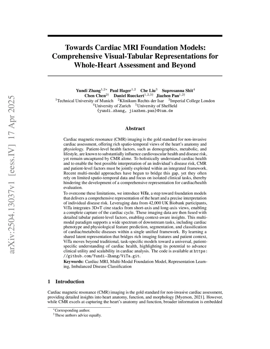 Cardiac magnetic resonance imaging is the gold standard for non-invasive cardiac assessment, offering rich spatio-temporal views of the cardiac anatomy and physiology. Patient-level health factors, such as demographics, metabolic, and lifestyle, are known to substantially influence cardiovascular health and disease risk, yet remain uncaptured by CMR alone. To holistically understand cardiac health and to enable the best possible interpretation of an individual's disease risk, CMR and patient-level factors must be jointly exploited within an integrated framework. Recent multi-modal approaches have begun to bridge this gap, yet they often rely on limited spatio-temporal data and focus on isolated clinical tasks, thereby hindering the development of a comprehensive representation for cardiac health evaluation. To overcome these limitations, we introduce ViTa, a step toward foundation models that delivers a comprehensive representation of the heart and a precise interpretation of individual disease risk. Leveraging data from 42,000 UK Biobank participants, ViTa integrates 3D+T cine stacks from short-axis and long-axis views, enabling a complete capture of the cardiac cycle. These imaging data are then fused with detailed tabular patient-level factors, enabling context-aware insights. This multi-modal paradigm supports a wide spectrum of downstream tasks, including cardiac phenotype and physiological feature prediction, segmentation, and classification of cardiac and metabolic diseases within a single unified framework. By learning a shared latent representation that bridges rich imaging features and patient context, ViTa moves beyond traditional, task-specific models toward a universal, patient-specific understanding of cardiac health, highlighting its potential to advance clinical utility and scalability in cardiac analysis.