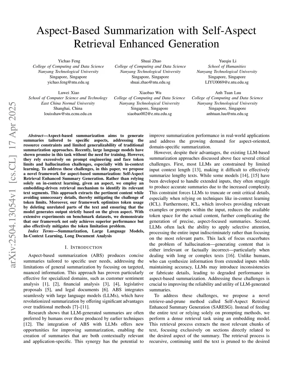 Aspect-based summarization aims to generate summaries tailored to specific aspects, addressing the resource constraints and limited generalizability of traditional summarization approaches. Recently, large language models have shown promise in this task without the need for training. However, they rely excessively on prompt engineering and face token limits and hallucination challenges, especially with in-context learning. To address these challenges, in this paper, we propose a novel framework for aspect-based summarization: Self-Aspect Retrieval Enhanced Summary Generation. Rather than relying solely on in-context learning, given an aspect, we employ an embedding-driven retrieval mechanism to identify its relevant text segments. This approach extracts the pertinent content while avoiding unnecessary details, thereby mitigating the challenge of token limits. Moreover, our framework optimizes token usage by deleting unrelated parts of the text and ensuring that the model generates output strictly based on the given aspect. With extensive experiments on benchmark datasets, we demonstrate that our framework not only achieves superior performance but also effectively mitigates the token limitation problem.