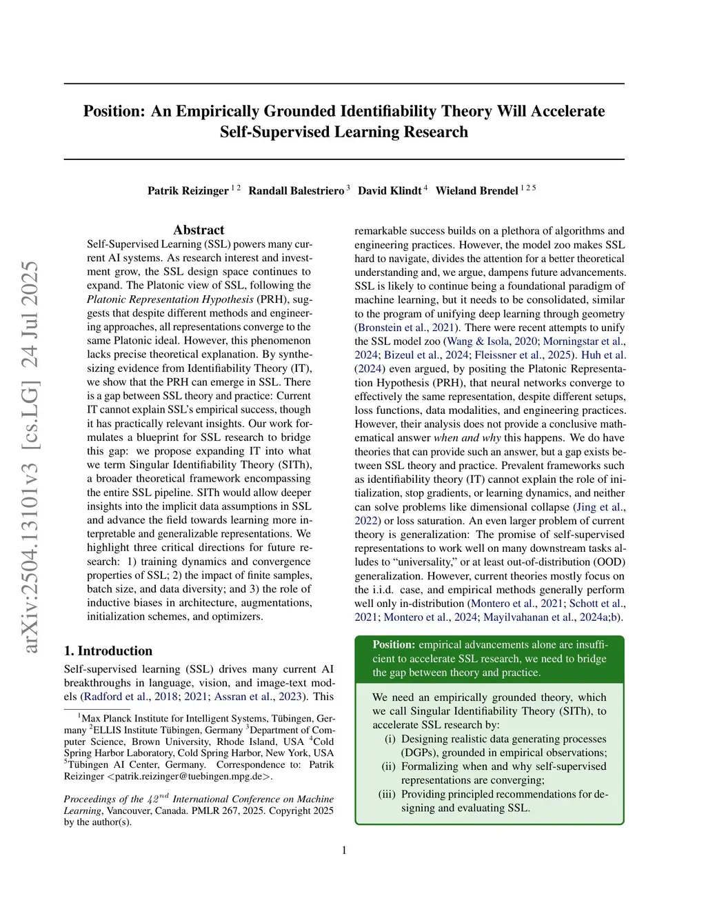 Self-Supervised Learning (SSL) powers many current AI systems. As research interest and investment grow, the SSL design space continues to expand. The Platonic view of SSL, following the Platonic Representation Hypothesis (PRH), suggests that despite different methods and engineering approaches, all representations converge to the same Platonic ideal. However, this phenomenon lacks precise theoretical explanation. By synthesizing evidence from Identifiability Theory (IT), we show that the PRH can emerge in SSL. However, current IT cannot explain SSL's empirical success. To bridge the gap between theory and practice, we propose expanding IT into what we term Singular Identifiability Theory (SITh), a broader theoretical framework encompassing the entire SSL pipeline. SITh would allow deeper insights into the implicit data assumptions in SSL and advance the field towards learning more interpretable and generalizable representations. We highlight three critical directions for future research: 1) training dynamics and convergence properties of SSL; 2) the impact of finite samples, batch size, and data diversity; and 3) the role of inductive biases in architecture, augmentations, initialization schemes, and optimizers.