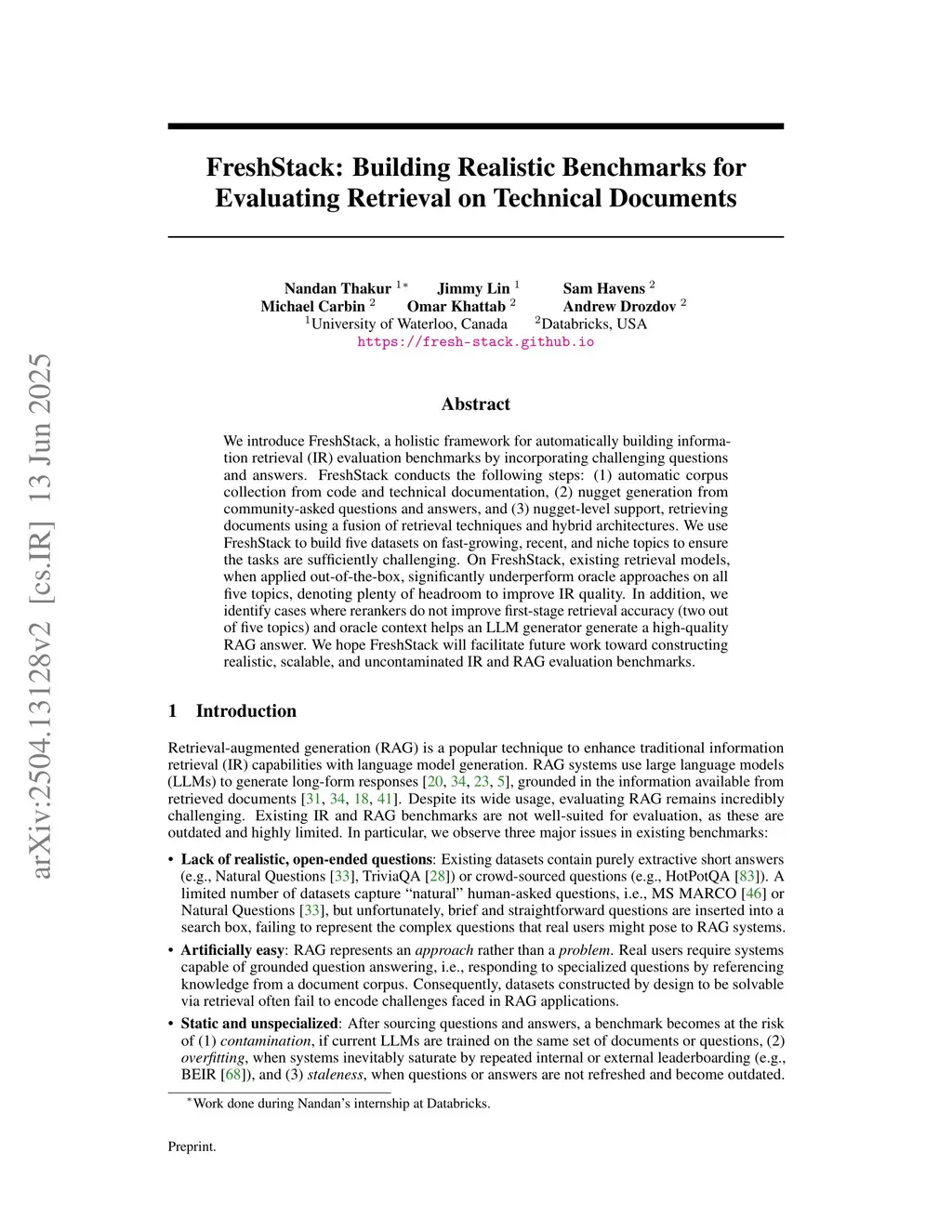 FreshStack: Building Realistic Benchmarks for Evaluating Retrieval on Technical Documents