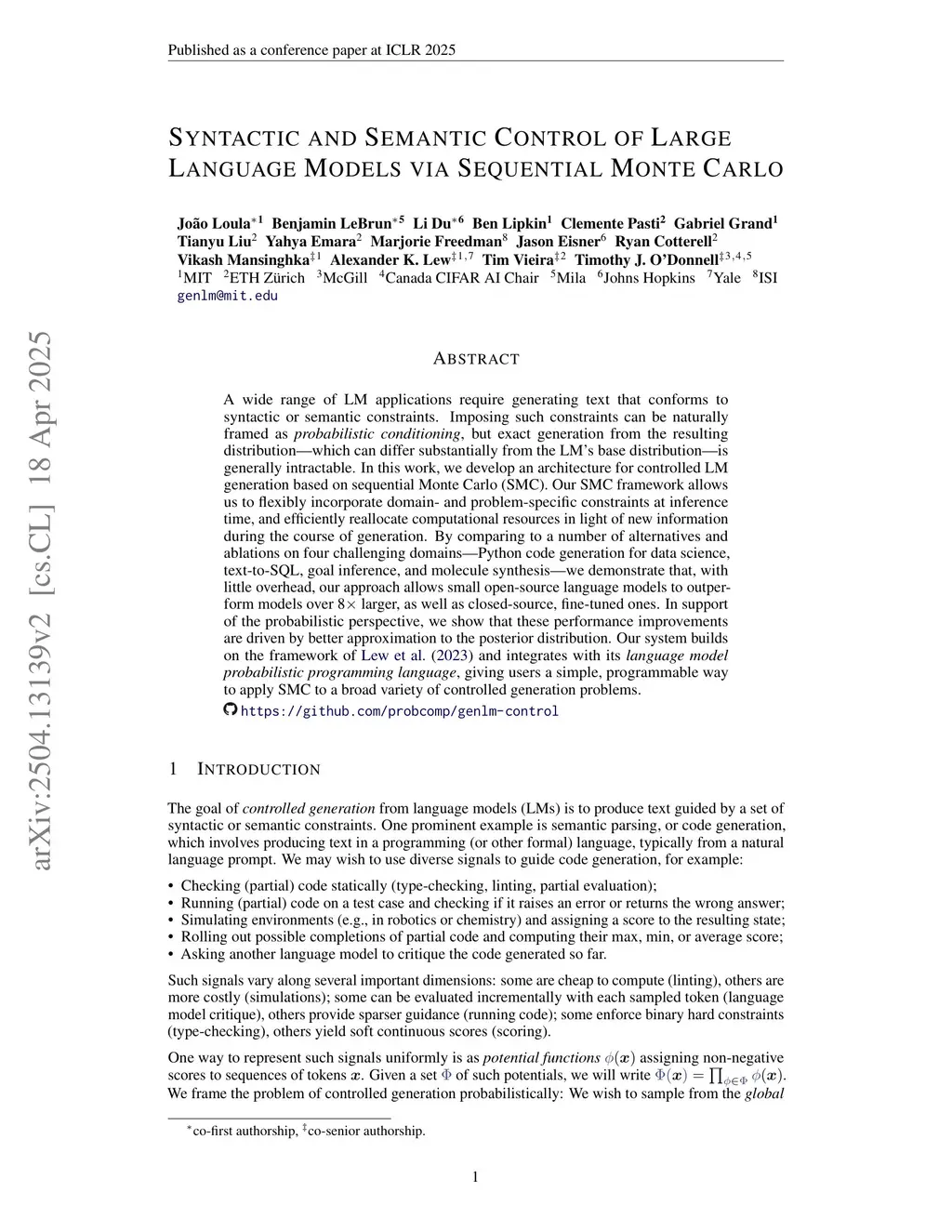 Syntactic and Semantic Control of Large Language Models via Sequential Monte Carlo