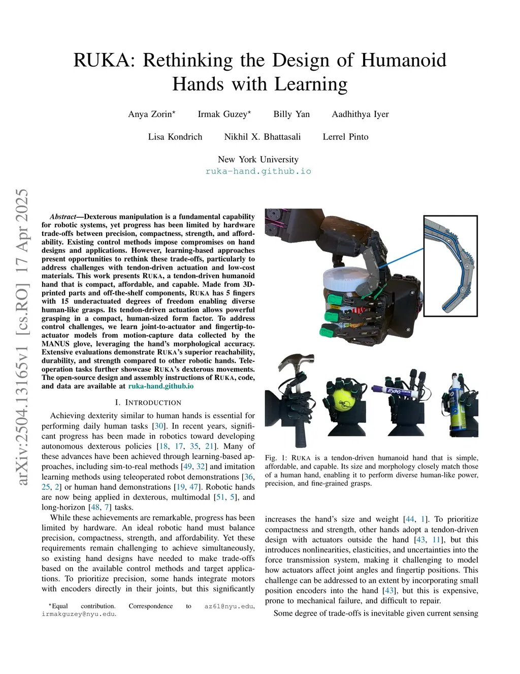 Dexterous manipulation is a fundamental capability for robotic systems, yet progress has been limited by hardware trade-offs between precision, compactness, strength, and affordability. Existing control methods impose compromises on hand designs and applications. However, learning-based approaches present opportunities to rethink these trade-offs, particularly to address challenges with tendon-driven actuation and low-cost materials. This work presents RUKA, a tendon-driven humanoid hand that is compact, affordable, and capable. Made from 3D-printed parts and off-the-shelf components, RUKA has 5 fingers with 15 underactuated degrees of freedom enabling diverse human-like grasps. Its tendon-driven actuation allows powerful grasping in a compact, human-sized form factor. To address control challenges, we learn joint-to-actuator and fingertip-to-actuator models from motion-capture data collected by the MANUS glove, leveraging the hand's morphological accuracy. Extensive evaluations demonstrate RUKA's superior reachability, durability, and strength compared to other robotic hands. Teleoperation tasks further showcase RUKA's dexterous movements. The open-source design and assembly instructions of RUKA, code, and data are available atthis https URL.