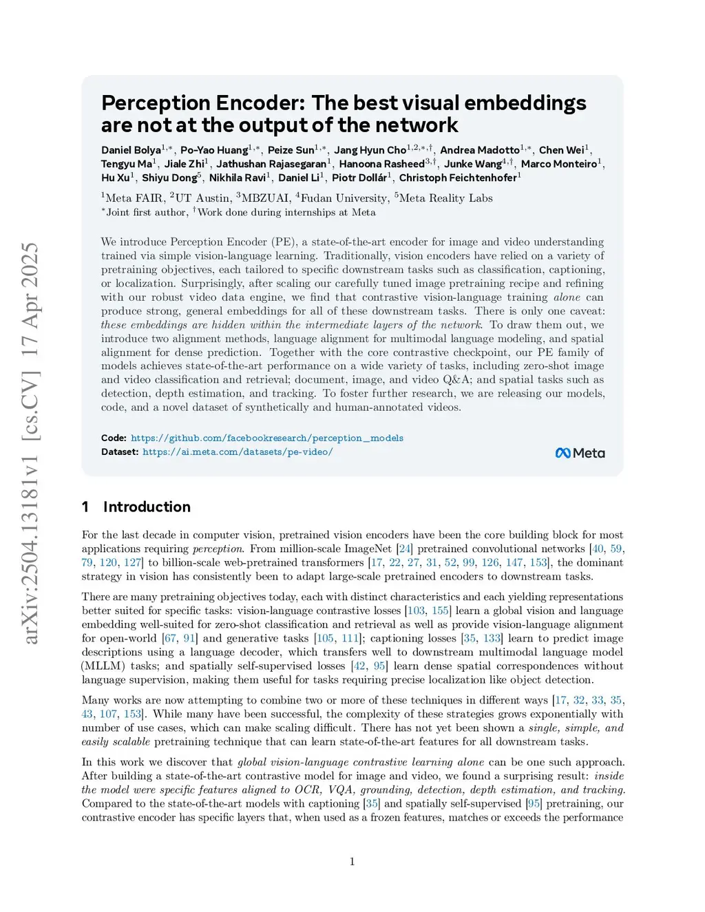 We introduce Perception Encoder (PE), a state-of-the-art vision encoder for image and video understanding trained via simple vision-language learning. Traditionally, vision encoders have relied on a variety of pretraining objectives, each tailored to specific downstream tasks such as classification, captioning, or localization. Surprisingly, after scaling our carefully tuned image pretraining recipe and refining with our robust video data engine, we find that contrastive vision-language training alone can produce strong, general embeddings for all of these downstream tasks. There is only one caveat: these embeddings are hidden within the intermediate layers of the network. To draw them out, we introduce two alignment methods: language alignment for multimodal language modeling, and spatial alignment for dense prediction. Together, our PE family of models achieves best-in-class results on a wide variety of tasks, including (1) zero-shot image and video classification and retrieval, simultaneously obtaining 86.6 average zero-shot ImageNet robustness and 76.9 zero-shot Kinetics-400 video classification; (2) document, image, and video Q&A, enabling 94.6 DocVQA, 80.9 InfographicVQA, and 82.7 PerceptionTest with an 8B LLM; and (3) spatial tasks such as detection, tracking, and depth estimation, setting a new COCO state-of-the-art of 66.0 box mAP. To foster further research, we release our models, code, and novel dataset of synthetically and human-annotated videos:this https URL