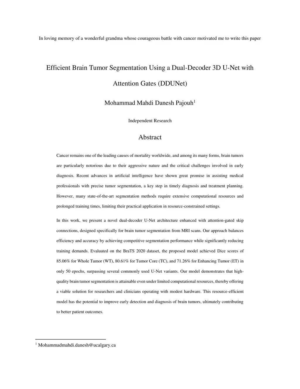 Cancer remains one of the leading causes of mortality worldwide, and among its many forms, brain tumors are particularly notorious due to their aggressive nature and the critical challenges involved in early diagnosis. Recent advances in artificial intelligence have shown great promise in assisting medical professionals with precise tumor segmentation, a key step in timely diagnosis and treatment planning. However, many state-of-the-art segmentation methods require extensive computational resources and prolonged training times, limiting their practical application in resource-constrained settings. In this work, we present a novel dual-decoder U-Net architecture enhanced with attention-gated skip connections, designed specifically for brain tumor segmentation from MRI scans. Our approach balances efficiency and accuracy by achieving competitive segmentation performance while significantly reducing training demands. Evaluated on the BraTS 2020 dataset, the proposed model achieved Dice scores of 85.06% for Whole Tumor (WT), 80.61% for Tumor Core (TC), and 71.26% for Enhancing Tumor (ET) in only 50 epochs, surpassing several commonly used U-Net variants. Our model demonstrates that high-quality brain tumor segmentation is attainable even under limited computational resources, thereby offering a viable solution for researchers and clinicians operating with modest hardware. This resource-efficient model has the potential to improve early detection and diagnosis of brain tumors, ultimately contributing to better patient outcomes