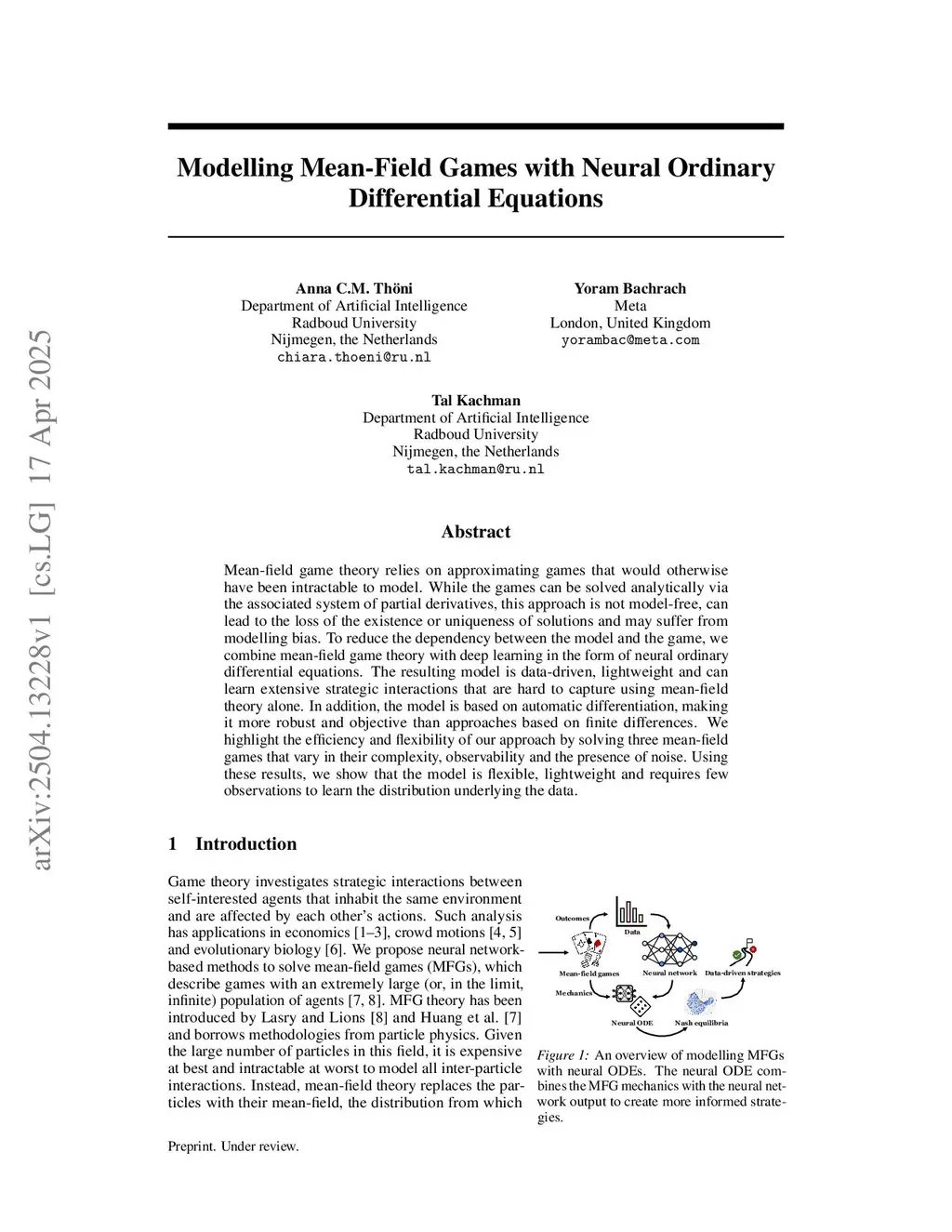 Mean-field game theory relies on approximating games that are intractible to model due to a very large to infinite population of players. While these kinds of games can be solved analytically via the associated system of partial derivatives, this approach is not model-free, can lead to the loss of the existence or uniqueness of solutions, and may suffer from modelling bias. To reduce the dependency between the model and the game, we introduce neural mean-field games: a combination of mean-field game theory and deep learning in the form of neural stochastic differential equations. The resulting model is data-driven, lightweight, and can learn extensive strategic interactions that are hard to capture using mean-field theory alone. In addition, the model is based on automatic differentiation, making it more robust and objective than approaches based on finite differences. We highlight the efficiency and flexibility of our approach by solving two mean-field games that vary in their complexity, observability, and the presence of noise. Lastly, we illustrate the model's robustness by simulating viral dynamics based on real-world data. Here, we demonstrate that the model's ability to learn from real-world data helps to accurately model the evolution of an epidemic outbreak. Using these results, we show that the model is flexible, generalizable, and requires few observations to learn the distribution underlying the data.