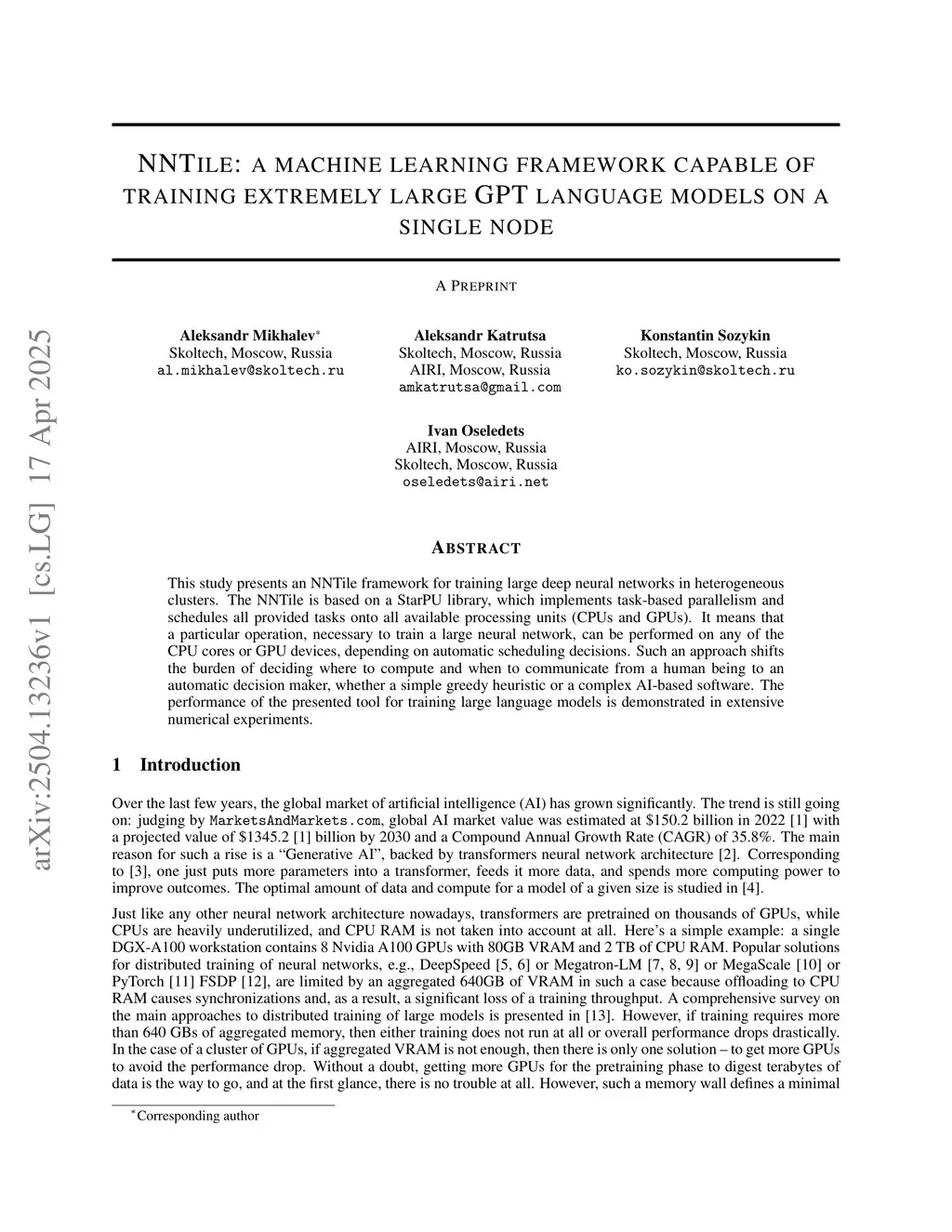 NNTile: a machine learning framework capable of training extremely large GPT language models on a single node