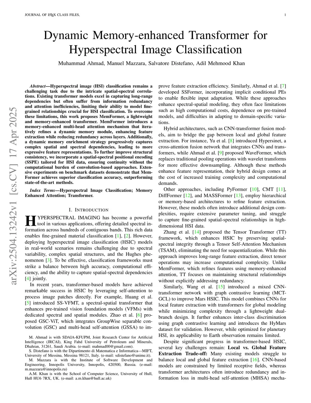 Dynamic Memory Transformer for Hyperspectral Image Classification