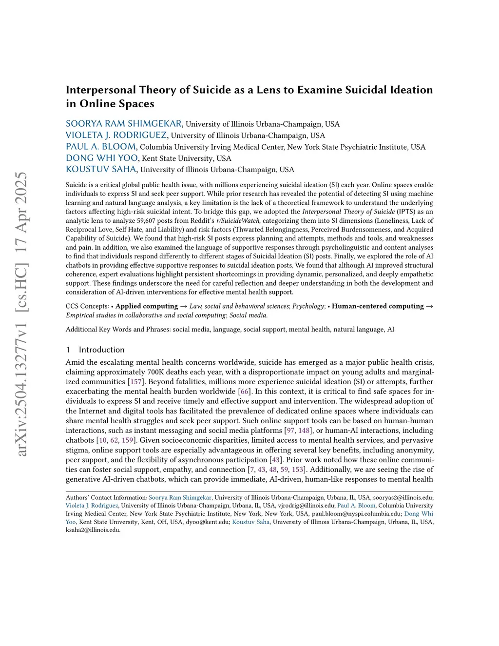 Suicide is a critical global public health issue, with millions experiencing suicidal ideation (SI) each year. Online spaces enable individuals to express SI and seek peer support. While prior research has revealed the potential of detecting SI using machine learning and natural language analysis, a key limitation is the lack of a theoretical framework to understand the underlying factors affecting high-risk suicidal intent. To bridge this gap, we adopted the Interpersonal Theory of Suicide (IPTS) as an analytic lens to analyze 59,607 posts from Reddit's r/SuicideWatch, categorizing them into SI dimensions (Loneliness, Lack of Reciprocal Love, Self Hate, and Liability) and risk factors (Thwarted Belongingness, Perceived Burdensomeness, and Acquired Capability of Suicide). We found that high-risk SI posts express planning and attempts, methods and tools, and weaknesses and pain. In addition, we also examined the language of supportive responses through psycholinguistic and content analyses to find that individuals respond differently to different stages of Suicidal Ideation (SI) posts. Finally, we explored the role of AI chatbots in providing effective supportive responses to suicidal ideation posts. We found that although AI improved structural coherence, expert evaluations highlight persistent shortcomings in providing dynamic, personalized, and deeply empathetic support. These findings underscore the need for careful reflection and deeper understanding in both the development and consideration of AI-driven interventions for effective mental health support.