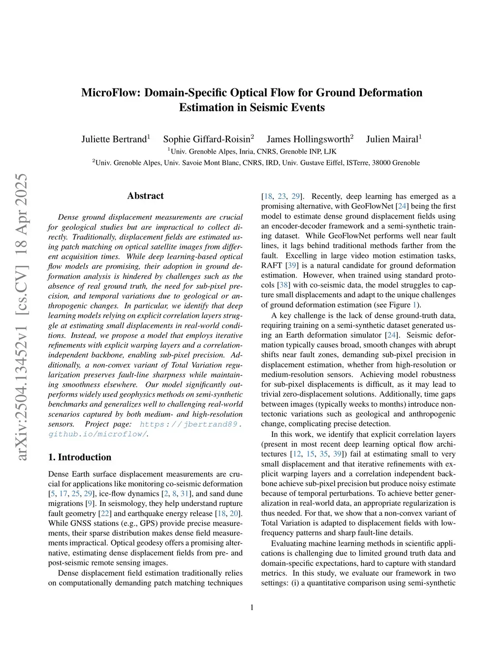 Dense ground displacement measurements are crucial for geological studies but are impractical to collect directly. Traditionally, displacement fields are estimated using patch matching on optical satellite images from different acquisition times. While deep learning-based optical flow models are promising, their adoption in ground deformation analysis is hindered by challenges such as the absence of real ground truth, the need for sub-pixel precision, and temporal variations due to geological or anthropogenic changes. In particular, we identify that deep learning models relying on explicit correlation layers struggle at estimating small displacements in real-world conditions. Instead, we propose a model that employs iterative refinements with explicit warping layers and a correlation-independent backbone, enabling sub-pixel precision. Additionally, a non-convex variant of Total Variation regularization preserves fault-line sharpness while maintaining smoothness elsewhere. Our model significantly outperforms widely used geophysics methods on semi-synthetic benchmarks and generalizes well to challenging real-world scenarios captured by both medium- and high-resolution sensors. Project page:this https URL.