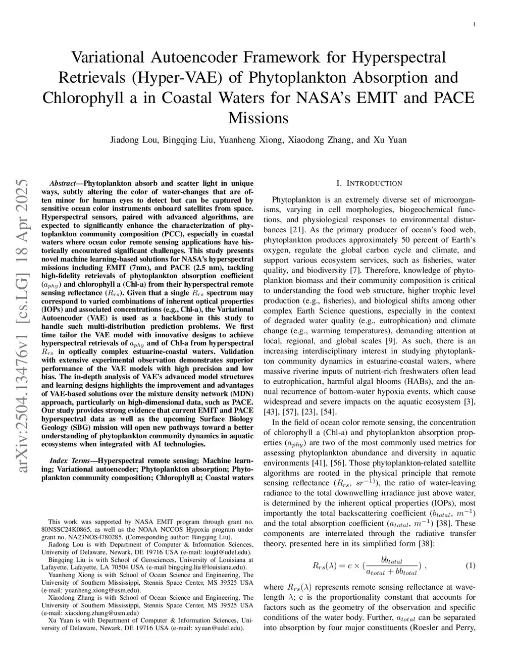 Phytoplankton absorb and scatter light in unique ways, subtly altering the color of water, changes that are often minor for human eyes to detect but can be captured by sensitive ocean color instruments onboard satellites from space. Hyperspectral sensors, paired with advanced algorithms, are expected to significantly enhance the characterization of phytoplankton community composition, especially in coastal waters where ocean color remote sensing applications have historically encountered significant challenges. This study presents novel machine learning-based solutions for NASA's hyperspectral missions, including EMIT and PACE, tackling high-fidelity retrievals of phytoplankton absorption coefficient and chlorophyll a from their hyperspectral remote sensing reflectance. Given that a single Rrs spectrum may correspond to varied combinations of inherent optical properties and associated concentrations, the Variational Autoencoder (VAE) is used as a backbone in this study to handle such multi-distribution prediction problems. We first time tailor the VAE model with innovative designs to achieve hyperspectral retrievals of aphy and of Chl-a from hyperspectral Rrs in optically complex estuarine-coastal waters. Validation with extensive experimental observation demonstrates superior performance of the VAE models with high precision and low bias. The in-depth analysis of VAE's advanced model structures and learning designs highlights the improvement and advantages of VAE-based solutions over the mixture density network (MDN) approach, particularly on high-dimensional data, such as PACE. Our study provides strong evidence that current EMIT and PACE hyperspectral data as well as the upcoming Surface Biology Geology mission will open new pathways toward a better understanding of phytoplankton community dynamics in aquatic ecosystems when integrated with AI technologies.