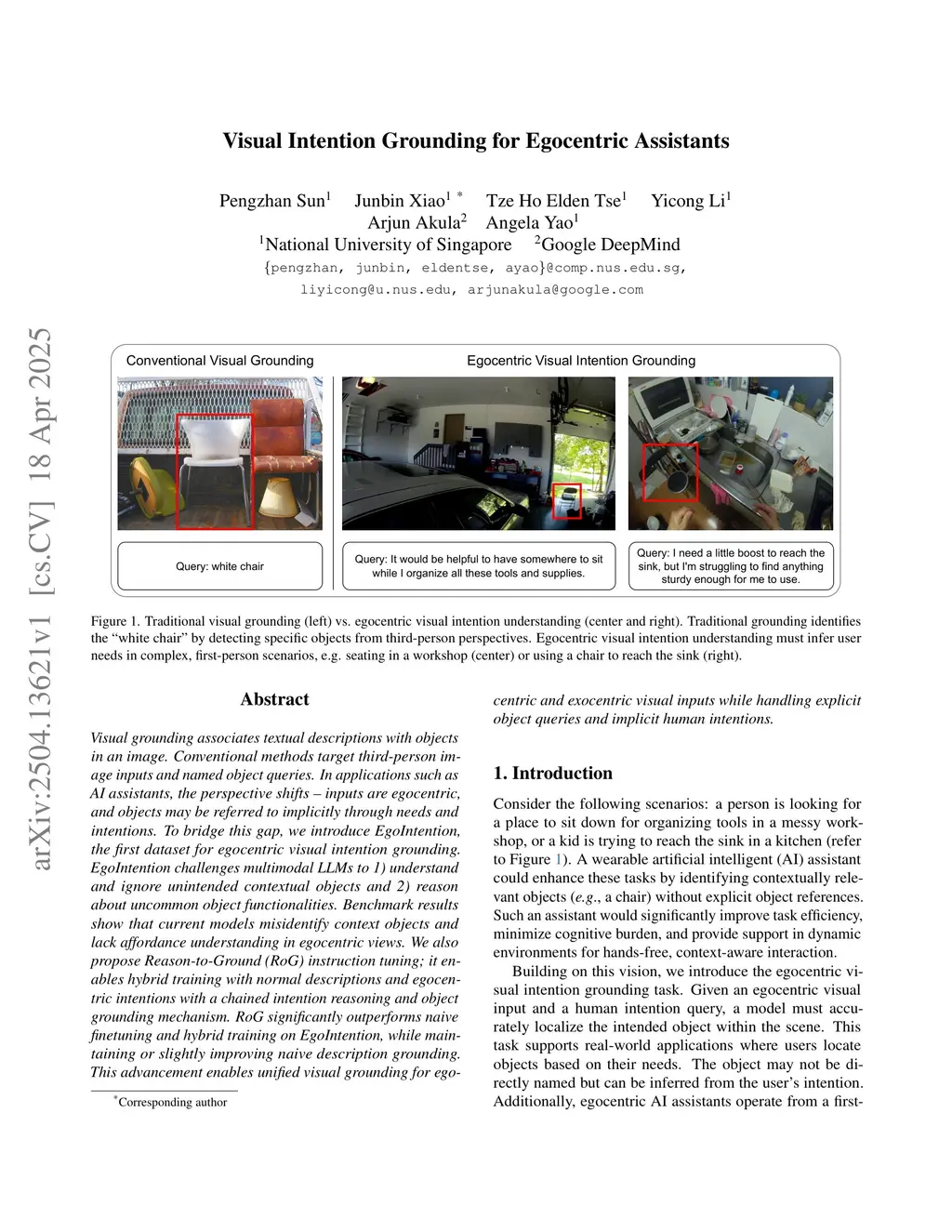 Visual grounding associates textual descriptions with objects in an image. Conventional methods target third-person image inputs and named object queries. In applications such as AI assistants, the perspective shifts -- inputs are egocentric, and objects may be referred to implicitly through needs and intentions. To bridge this gap, we introduce EgoIntention, the first dataset for egocentric visual intention grounding. EgoIntention challenges multimodal LLMs to 1) understand and ignore unintended contextual objects and 2) reason about uncommon object functionalities. Benchmark results show that current models misidentify context objects and lack affordance understanding in egocentric views. We also propose Reason-to-Ground (RoG) instruction tuning; it enables hybrid training with normal descriptions and egocentric intentions with a chained intention reasoning and object grounding mechanism. RoG significantly outperforms naive finetuning and hybrid training on EgoIntention, while maintaining or slightly improving naive description grounding. This advancement enables unified visual grounding for egocentric and exocentric visual inputs while handling explicit object queries and implicit human intentions.