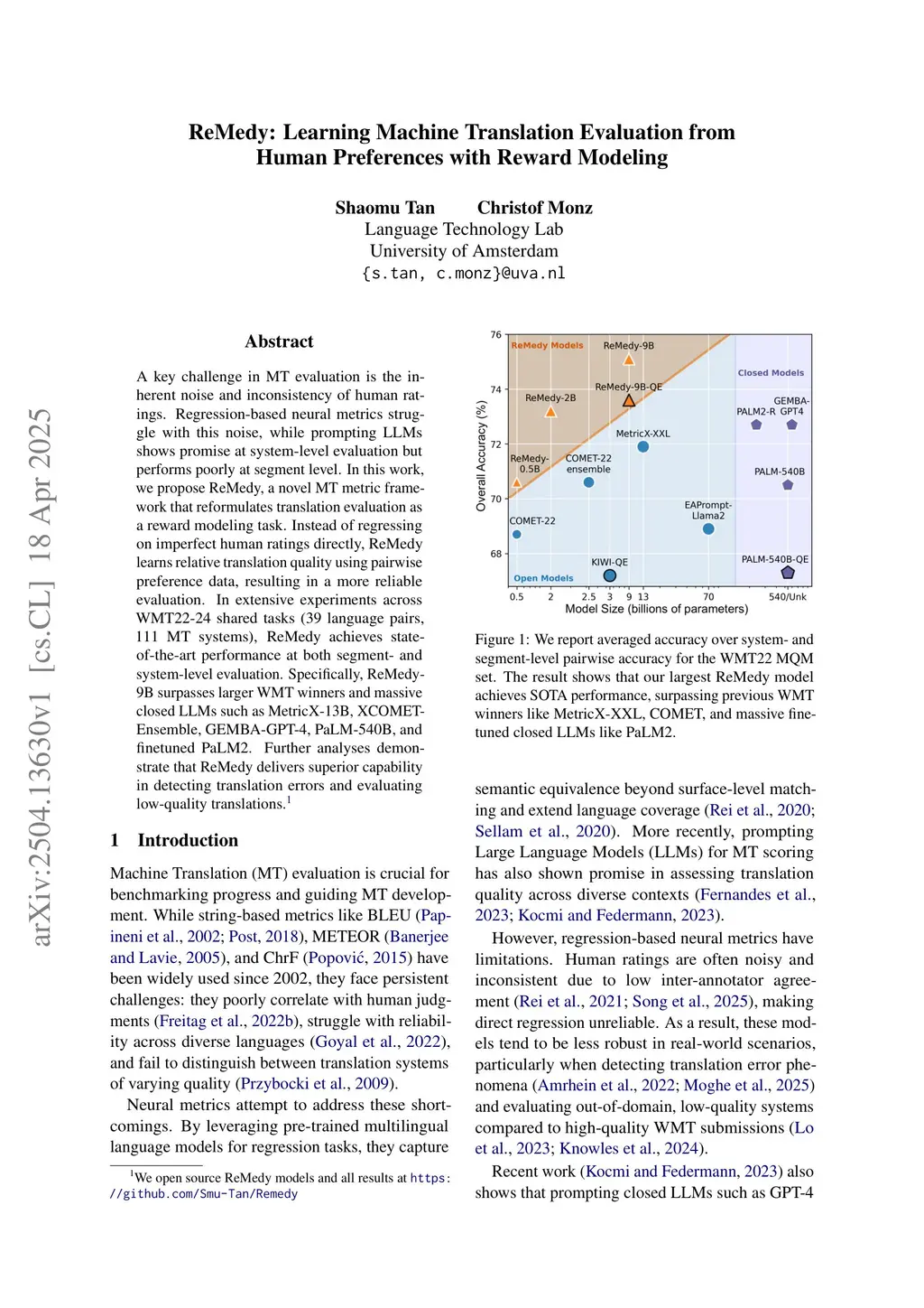 A key challenge in MT evaluation is the inherent noise and inconsistency of human ratings. Regression-based neural metrics struggle with this noise, while prompting LLMs shows promise at system-level evaluation but performs poorly at segment level. In this work, we propose ReMedy, a novel MT metric framework that reformulates translation evaluation as a reward modeling task. Instead of regressing on imperfect human ratings directly, ReMedy learns relative translation quality using pairwise preference data, resulting in a more reliable evaluation. In extensive experiments across WMT22-24 shared tasks (39 language pairs, 111 MT systems), ReMedy achieves state-of-the-art performance at both segment- and system-level evaluation. Specifically, ReMedy-9B surpasses larger WMT winners and massive closed LLMs such as MetricX-13B, XCOMET-Ensemble, GEMBA-GPT-4, PaLM-540B, and finetuned PaLM2. Further analyses demonstrate that ReMedy delivers superior capability in detecting translation errors and evaluating low-quality translations.